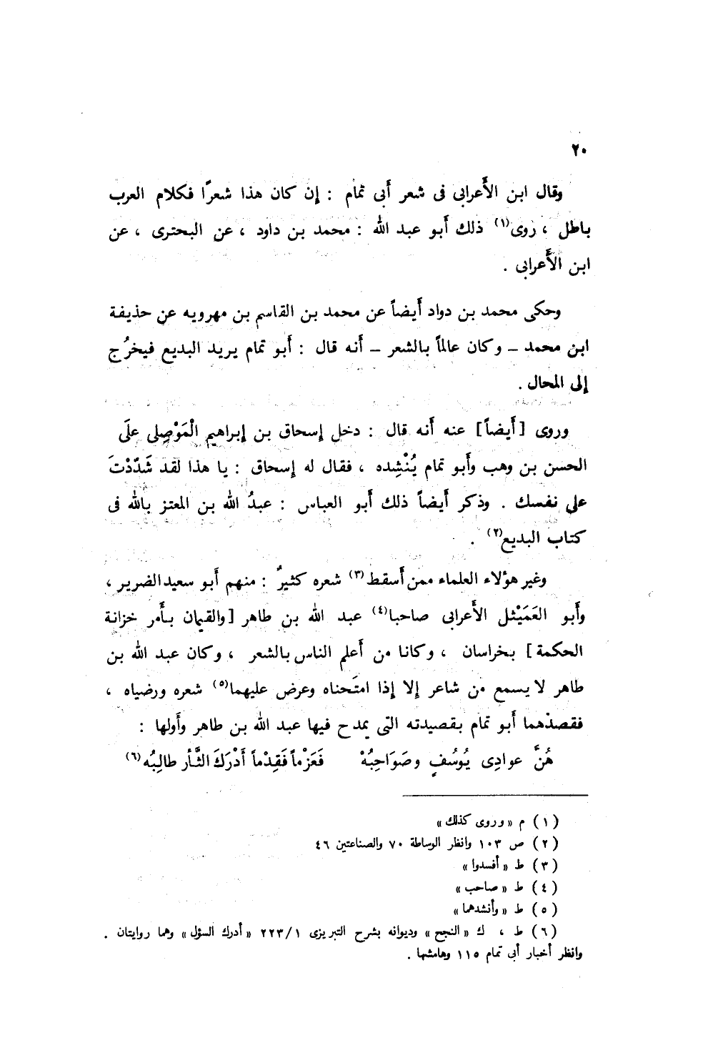 وقال ابن الأعرابي في شعر أب يتمام: إن كان هذا شعراً فكلام العرب باطلٌ، روى ذلك أبو عبد الله محمد ابن داود عن البحتري عن ابن الأعرابي. وحكى محمد بن داود أيضاً عن محمد بن القاسم بن مهرويه عن حذيفة بن محمد - وكان عالماً بالشعر - أنه قال: أبو تمام يريد البديع فيخرج إلى المحال. وروى عنه أنه قال: دخل إسحاق بن إبراهيم الموصلي على الحسن بن وهب وأبو تمام ينشده، فقال له إسحاق: يا هذا لقد شددت على نفسك. وذكره أيضاً أبو العباس عبد الله بن المعتز في كتاب البديع. وغير هؤلاء العلماء ممن أسقط شعره كثيرٌ: منهم أبو سعيد الضرير، وأبو العميثل الأعرابي صاحبا عبد الله بن طاهر " القيمان بأمر خزانة الحكمة " بخراسان، وكانا من أعلم الناس بالشعر، وكان عبد الله بن طاهر لا يسمع من شاعر إلا إذا امتحناه وأنشدهما شعره ورضياه، فقصدهما أبو تمام بقصيدته التي يممدح فيها عبد الله بن طاهر وأولها: