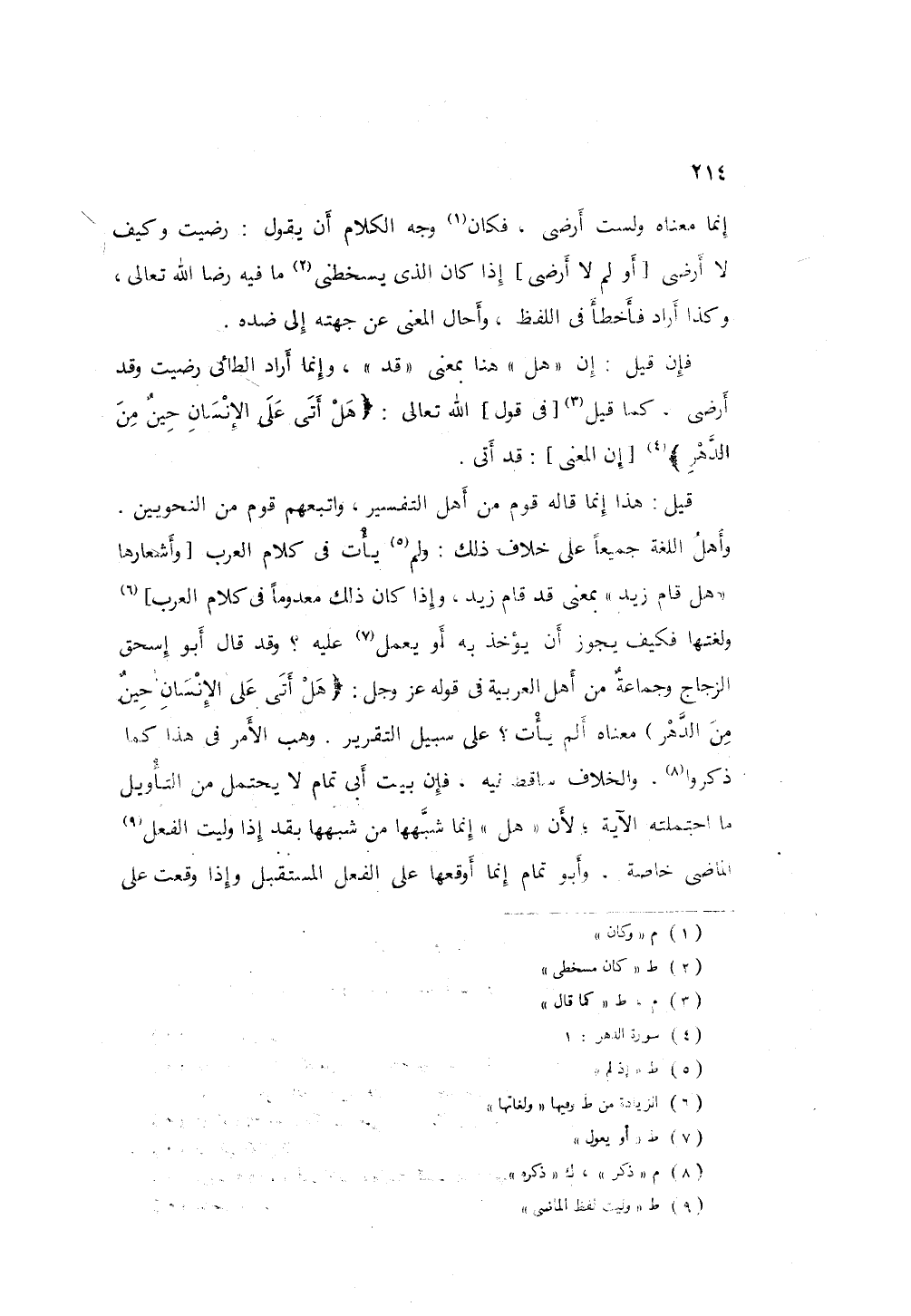 قيل: هذا إنما قاله قومٌ من أهل التفسير، وتبعهم قوم من النحويين. وأهل اللغة جميعاً على خلاف ذلك؛ إذ لم يأت في كلام العرب وأشعارها " هل قام زيد " بمعنى قد قام زيد، وإذا كان ذلك معدوماً في كلام العرب ولغاتها فكيف يجوز أن يؤخذ به أو يعول عليه؟ وقد قال أبو إسحاق الزجاج وجماعةٌ من أهل العربية في قوله عز وجل " هل أتى على الإنسان " معناه ألم يأت، على سبيل التقرير. وهب الأمر في هذا كما ذكروا، والخلاف ساقط فيه، فإن بيت أبي تمام لا يحتمل من التأويل ما احتملته الآية؛ لأن " هل " إنما شبهها من شبهها بقد إذا وليت لفظ الماضي خاصة، وأبو تمام إنما أوقعها على الفعل [المستقبل وإذا وقعت على]