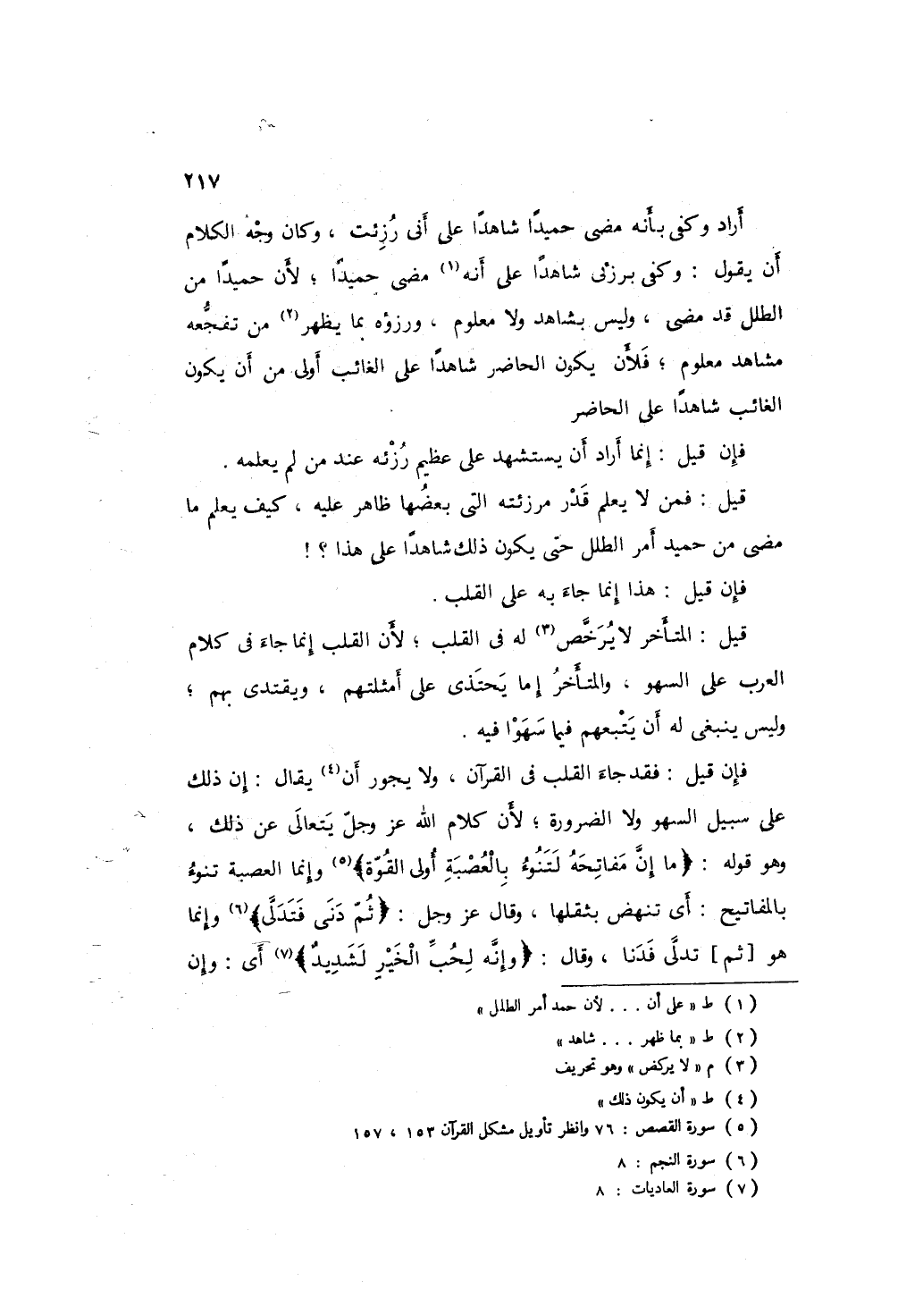 فإن قيل: فقد جاء القلب في القرآن، ولا يجوز أن يكون ذلك على سبيل السهو والضرورة؛ لأن كلام الله عز وجل يتعالى عن ذلك، وهو قوله: " ما إن مفاتحه لتنوء بالعصبة أولى القوة " وإنما العصبة تنوء بالمفاتيح، أي تنهض بثقلها، وقال عز وجل: " ثم دنى فتدلى " وإنما هو تدلى فدنا، وقال: " وإنه لحب الخير لشديدٌ " أي: وإن