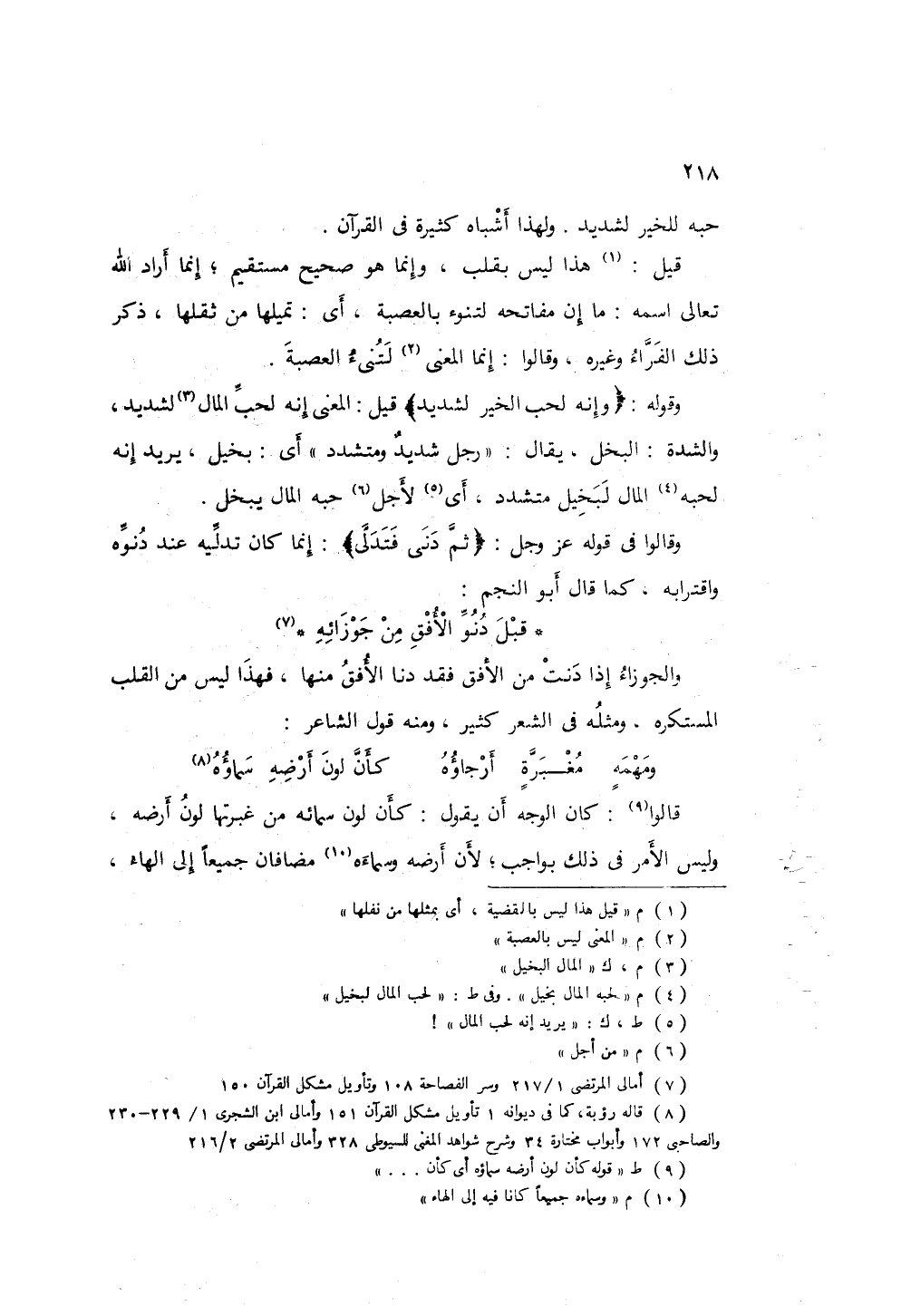 قيل: هذا ليس بقلب، وإنما هو صحيح مستقيم، إنما أراد الله تعالى اسمه: ما إن مفاتحه لتنوء بالعصبة، أي: نميلها من ثقلها، ذكر ذلك الفراء وغيره، وقالوا: إنما المعنى لتنيء العصبة، وقوله " وإنه لحب الخير لشديد " قيل: المعنى إنه لحب المال لشديد، والشدة: البخل، يقال " رجل شديدٌ وتشدد " أي: بخيل، يريد إنه لحب المال لبخيل متشدد، يريد إنه لحب المال: أي لأجل خبه المال يبخل، وقالوا في قوله عز وجل: " ثم دنى فتدلى ": إنما كان تدليه عند دنوه واقترابه، وكما قال أبو النجم: