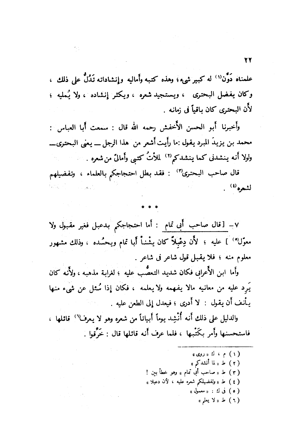 7 - قال صاحب أب يتمام: أما احتجاجكم بدعبل فغير مقبولٍ ولا معولٍ عليه؛ لأن دعبلاً كان يشنأ أبا تمام ويحسده، وذلك مشهور معلوم منه؛ فلا يقبل قول شاعر في شاعر، وأما ابن الأعرابي فكان شديد التعصب عليه؛ لغرابة مذهبه، ولأنه كان يرد عليه من معانيه ما لايفهمه ولا يعلمه، فكان إذا سئل عن شيء منها يأنف أن يقول لا أدري فيعدل إلى الطعن عليه، والدليل على ذلك أنه أنشد يوماً أبياتاً من شعره، وهو لا يعلم قائلها، فاستحسنها وأمر بكتبها، فلما عرف أنه قائلها قال: خرقوا