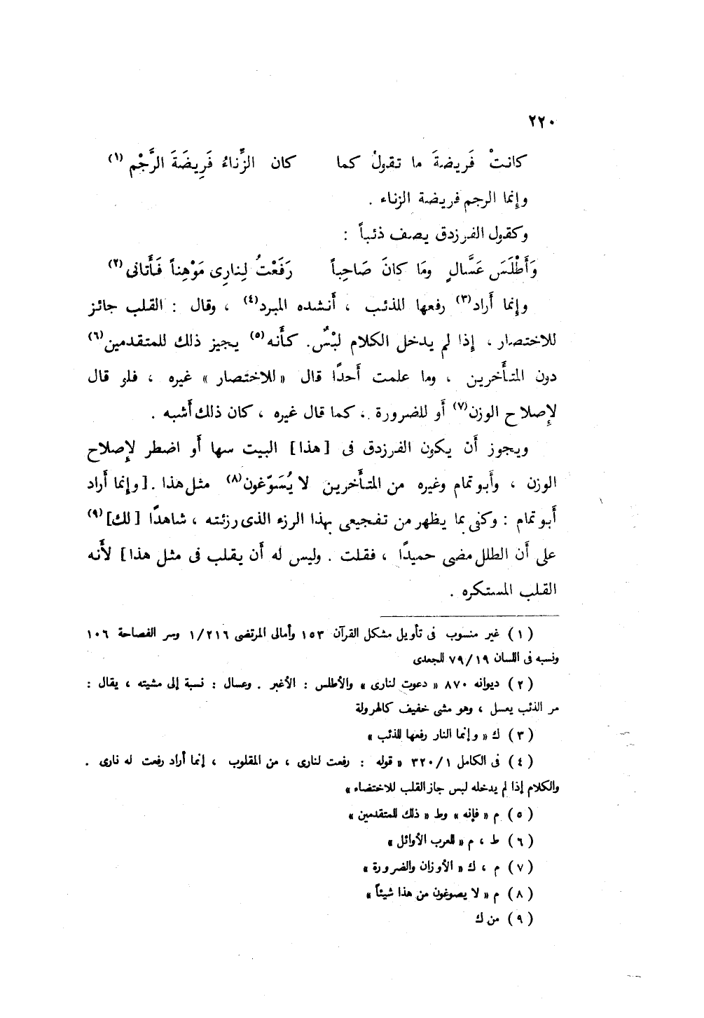 وإنما النار رفعها للذئب، وأنشده المبرد، وقال: القلب جائز للأختصار، إذا لم يدخل الكلام لبسٌ، كأنه يجيز ذلك للمتقدمين دون المتأخرين، وما علمت أحداً قال " للأختصار " غيره، فلو قال لإصلاح الوزن أو للضرورة كما قال غيره كان ذلك أشبه، ويجوز أن يكون الفرزدق ف يهذا البيت سها أو اضطر لإصلاح الوزن، وأبو تمام وغيره من المتأخرين لا يسوغون مثل هذا وإنما أراد أبو تمام وكفى بما يظهر من تفجعي بهذا الرزء الذي رزئته شاهداً على أن الطلل مضى حميدا، قلت: وليس له أن يقلب في مثل هذا؛ لأنه القلب المستكره.