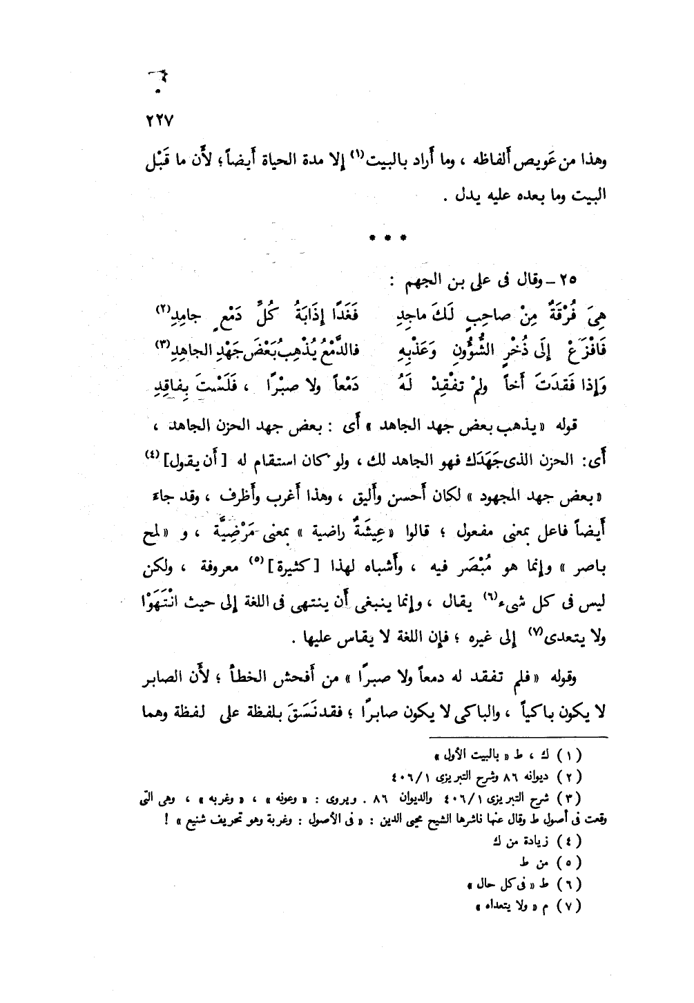 قوله " يذهب بعض جهد الجاهد " أي: بعض جهد الحزن الجاهد، أي الحزن الذي جهدك فهو الجاهد لك، ولو كان استقام له أن يقول " بعض جهد المجهود " لكان أحسن وأليق، وهذا أغرب وأظرف.