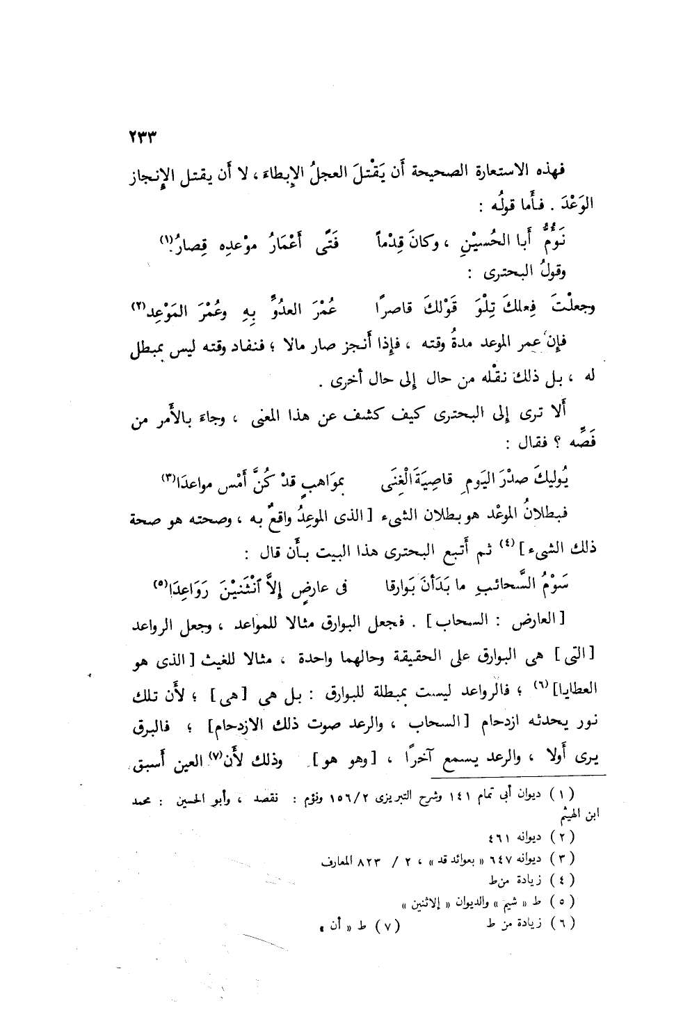 فإن عمر الموعد مدة وقته؛ فإذا أنجز صار مالا؛ فنفاد وقته ليس بمبطل له، بل ذلك نقله من حال إلى حال أخرى. ألا ترى إلى البحتري كيف كشف عن هذا المعنى، وجاء بالأمر من فصه؟ فقال: