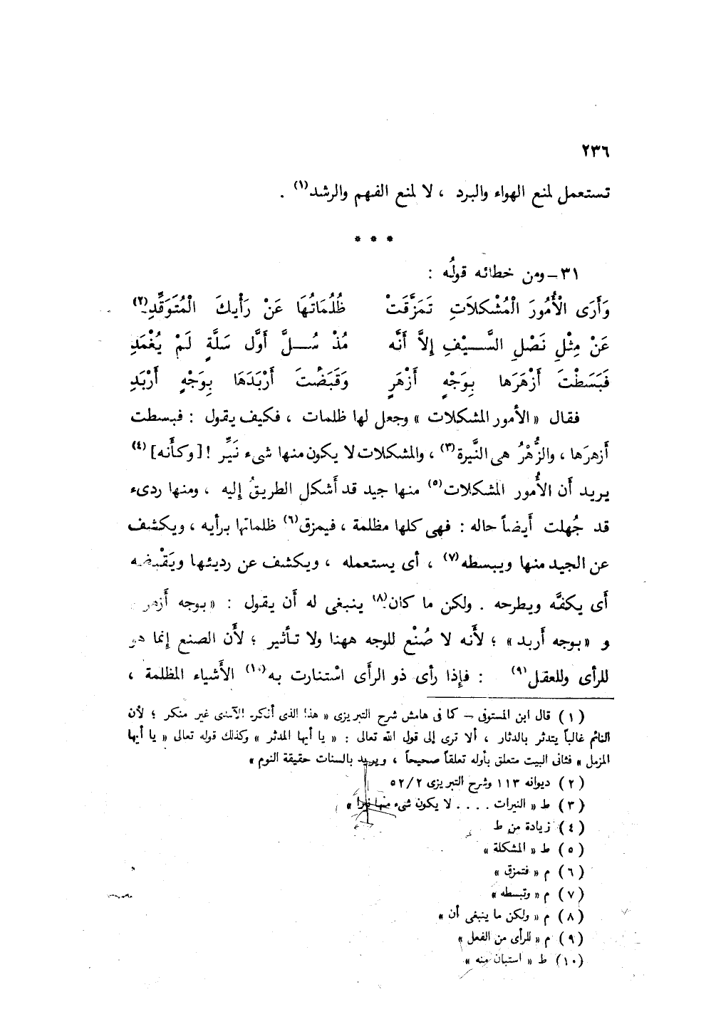 فقال " الأمور المشكلات " وجعل لها ظلمات، فكيف يقول: فبسطت أزهرها، والزهر هي النيرات، والمشكلات لا يكون شيء منها نيراً؟ وكأنه يريد أن الأمور المشكلة منها جيد قد أشكل الطريق إليه، ومنها ردئ قد جهلت أيضاً حاله؛ فهي كلها مظلمة، فيمزق ظلماتها برأيه، ويكشف عن الجيد منها ويبسطه: أي ستعمله، ويكشف عن رديئها ويقبضه: أي يكفه ويطرحه، ولكن ما كان ينبغي له أن يقول " بوجه أزهر " و " بوجه أربد "؛ لأنه لا صنع ههنا للوجه ولا تأثير؛ لأن الصنع إنما هو للرأي وللعقل؛ فإذا رأى ذو الرأي أمراً استبان منه الأشياء المظلمة،