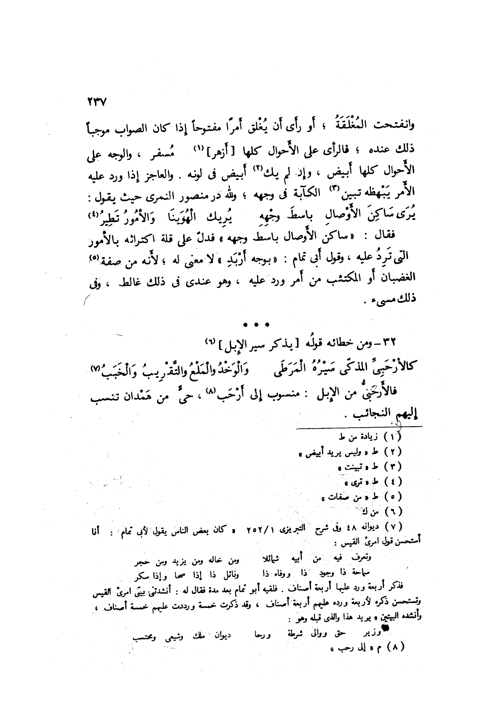 فقال " ساكن الأوصال باسط وجهه " فدل على قلة اكتراثه بالأمور التي ترد عليه، وقول أبي تمام " بوجهٍ أربد " لا معنى له؛ لأنه من صفات الغضبان أو المكتئب من أمر ورد عليه، وو عندي في ذلك غالط، وفي ذلك مسيء.