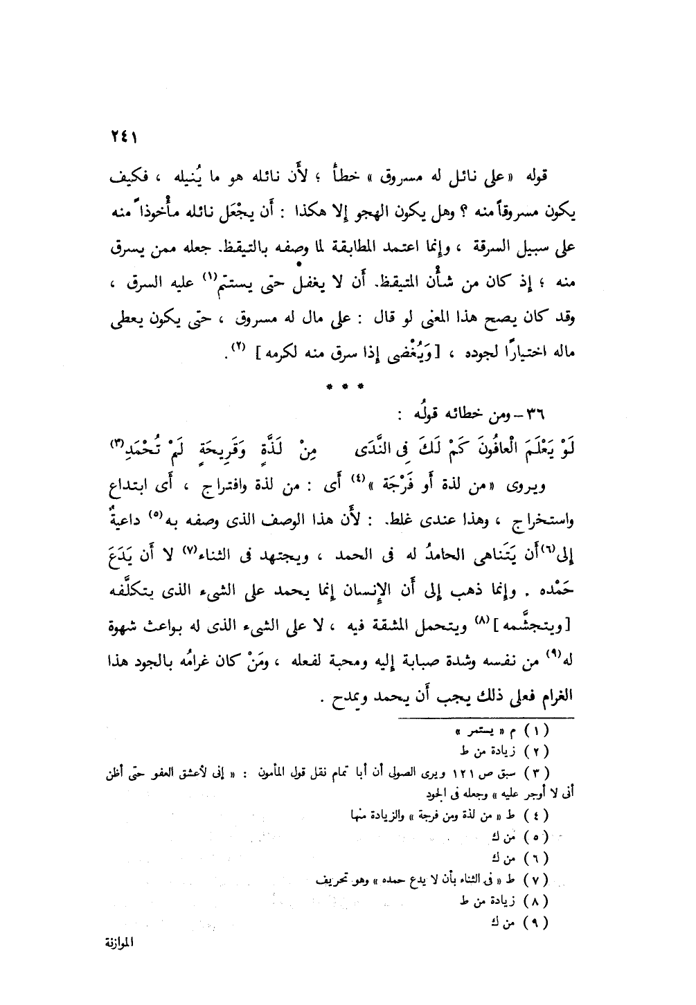قوله " على نائل له مسروق " خطأ؛ لأن نائله هو ما ينيله، فكيف يكون مسروقاً منه؟ وهل يكون الهجو إلا هكذا: أن يجعل نائله مأخوذاً منه على طريق السرقة؟ وإنما اعتمد المطابقة لما وصفه بالتيقظ جعله ممن يسرق منه؛ إذ كان من شأن المتيقظ أن لا غفل حتى يستتم عليه السرق، وقد كان يصح هذا المعنى لو قال: علىمال له مسروق، حتى يكون يعطى ما له اختياراً لجوده ويغضى إذا سرق منه لكرمه.