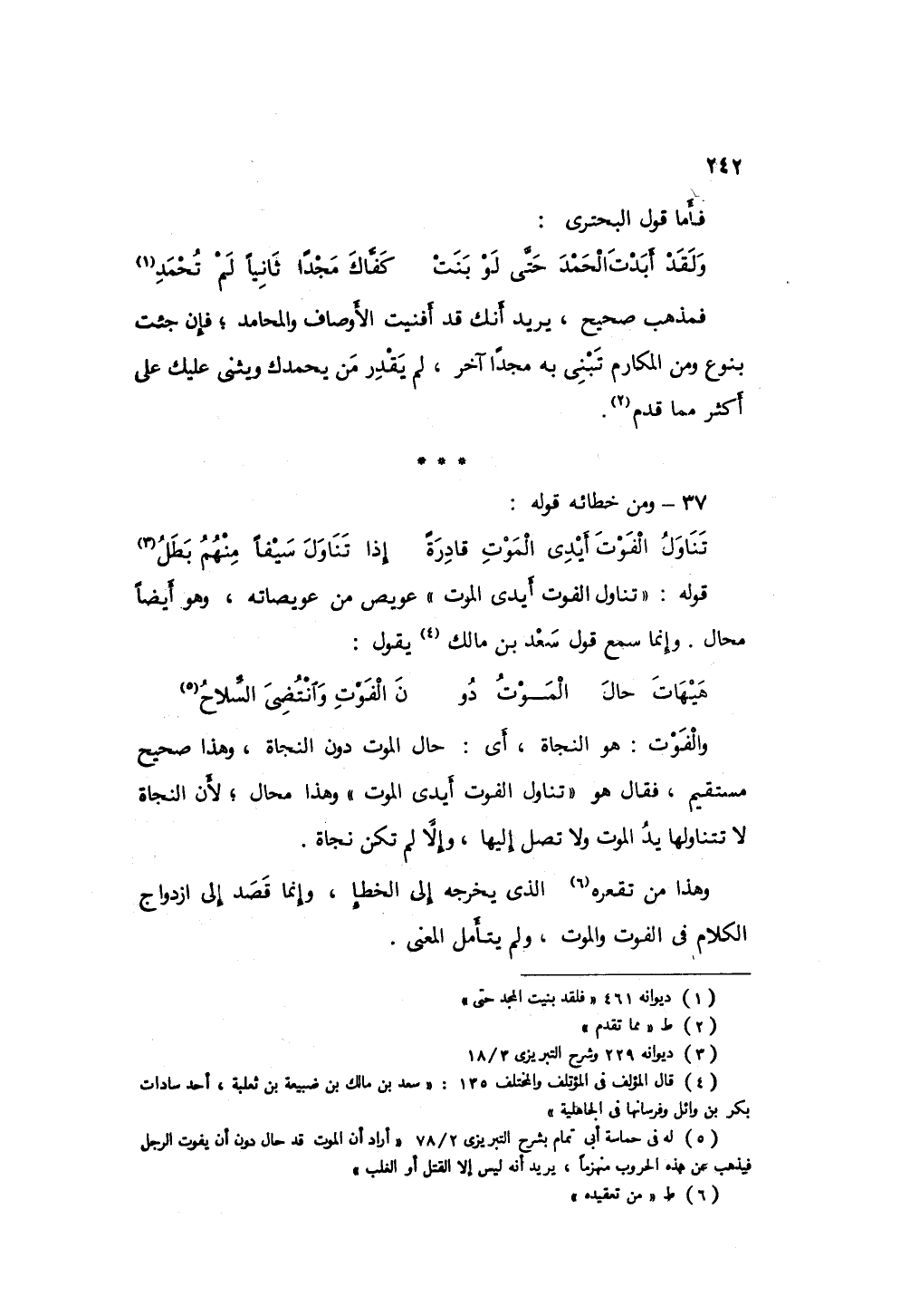 والفوت: هو النجاة، أي حال الموت دون النجاة، وهذا صحيح مستقيم، فقال هو " تناول الفوت أيدي الموت " وهذا محال؛ لأن النجاة لا تتناولها يد الموت، ولا تصل إليها، وإلا لم تكن نجاة، وهذا من عقيده الذي يخرجه إلى الخطأ، وإنما قصد إلى ازدواج الكلام في الفوت والموت، ولم يتأمل المعنى،