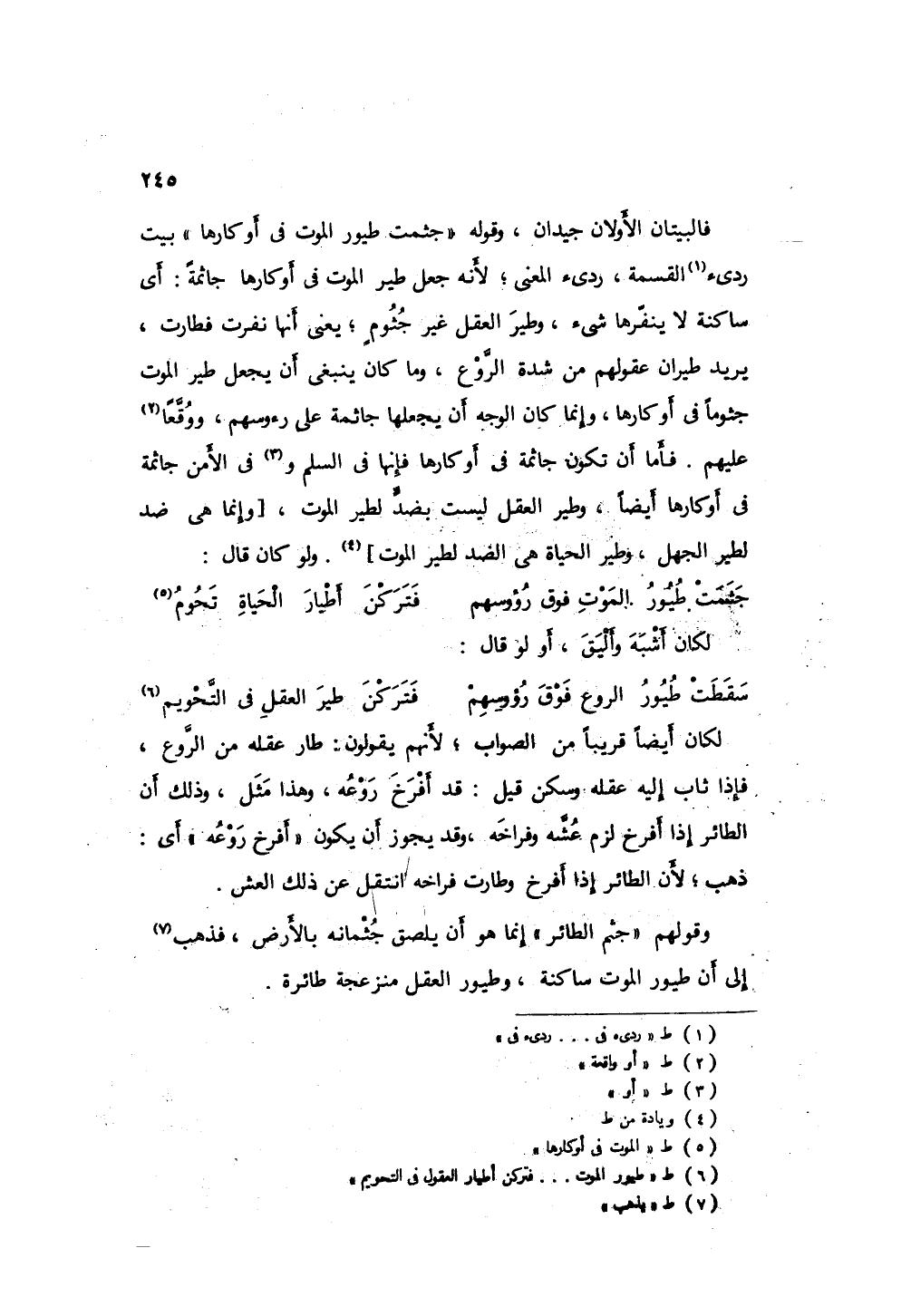 فالبيتان الأولان جيدان، وقوله جثت طيور الموت في أوكارها بيت ردئ في القسمة، ردئ في المعنى؛ لأنه جعل طير الموت في أوكارها جاثمةً: أي ساكنة لا ينفرها شيء، وطير العقل غير جثومٍ، يعني أنها قد نفرت فطارت، يريد طيران عقولهم من شدة الروع، وما كان ينبغي أن يجعل طير الموت جثوما في أوكارها، وإنما كان الوجه أن يجعلها جاثمة على رؤوسهم، أو واقعة عليهم، فأما أن تكون جائمة في أوكارها فإنها في السلم أو في الأمن جاثمة في أوكارها أيضاً، وطير العقل ليست بضد لطير الموت، وإنما هي ضد لطير الجهل، وطير الحياة هي الضد لطير الموت، ولو كان قال: