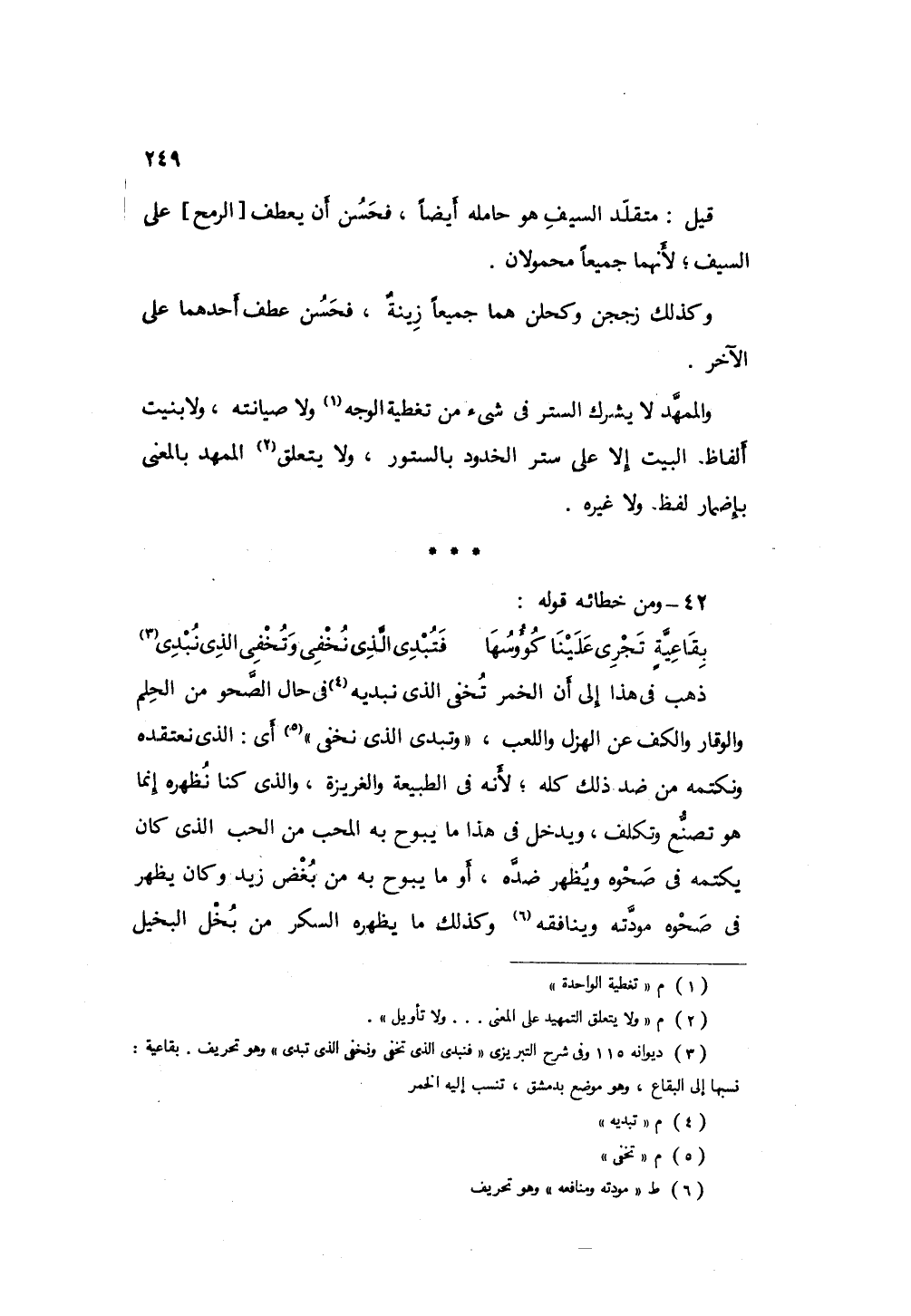 ذهب في هذا إلى أن الخمر تخفى الذي نبديه ف يحال الصحو من الحلم والوقار والكف عن الهزل والللعب، وتبدى الذي نخفي أي: الذي نعتقده ونكتمه من ضد ذلك كله؛ لأنه في الطبيعة والغريزة.