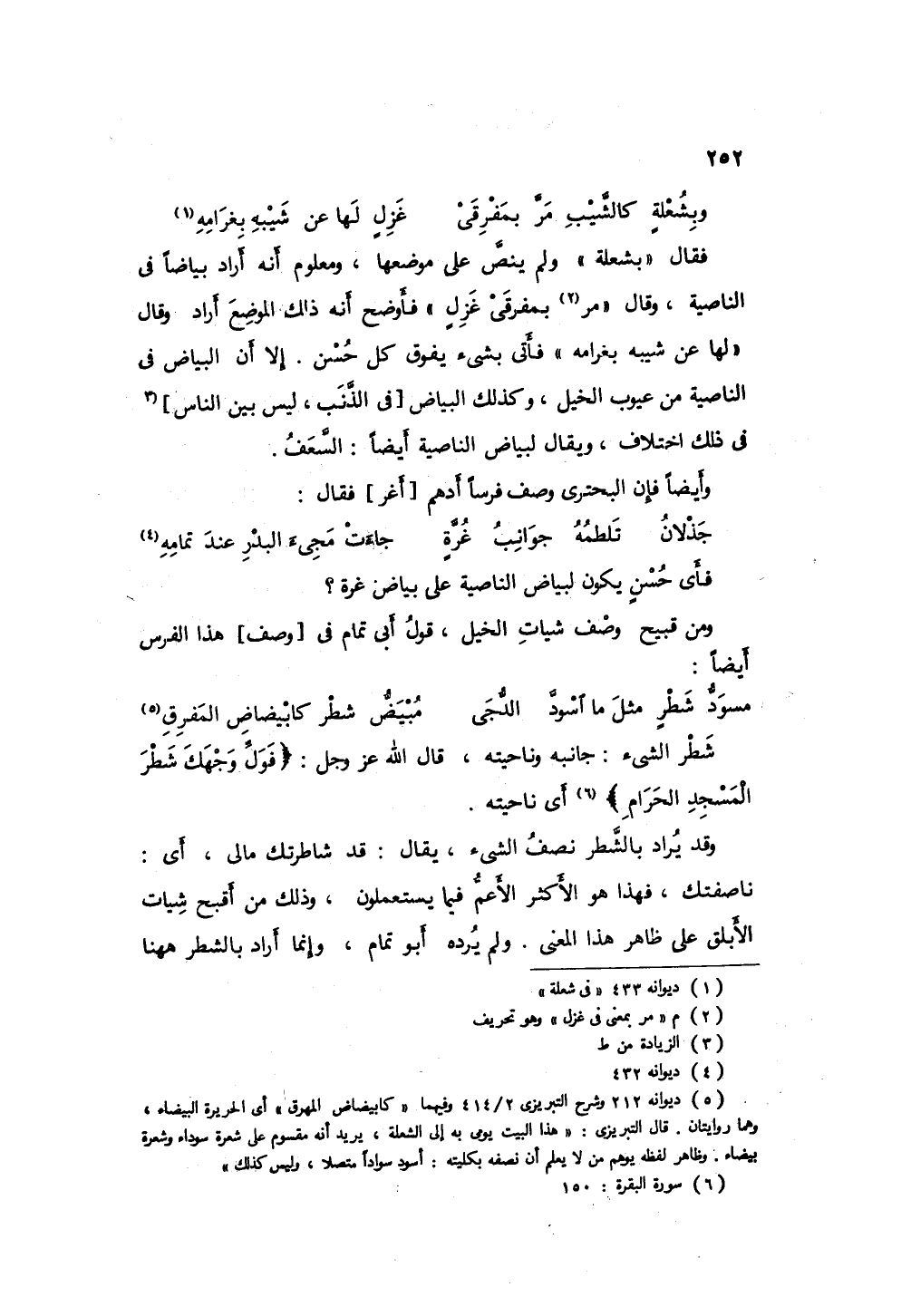 فأي حسن يكون لبياض ناصية على بياض غرة؟ ومن قبيح وصف شيات الخيل قول أبي تمام ف يهذا الفرس أيضاً: