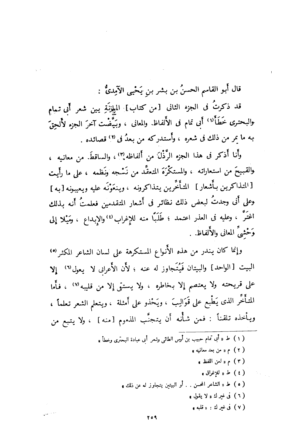 قال أبو القاسم الحسن بن بشر بن يحيى الآمدي: قد ذكرت في الجزء الثاني الموازنة بين شعر أبي تمام حبيب بن أوس الطائي وشعر أبي عبادة الوليد بن عبيدٍ البحتري، وخطأ أبي تمام في الألفاظ ولامعانين وبيضت آخر الجزء لألحق به ما يمر من ذلك في شعره، وأستدركه من بعد في قصائده.