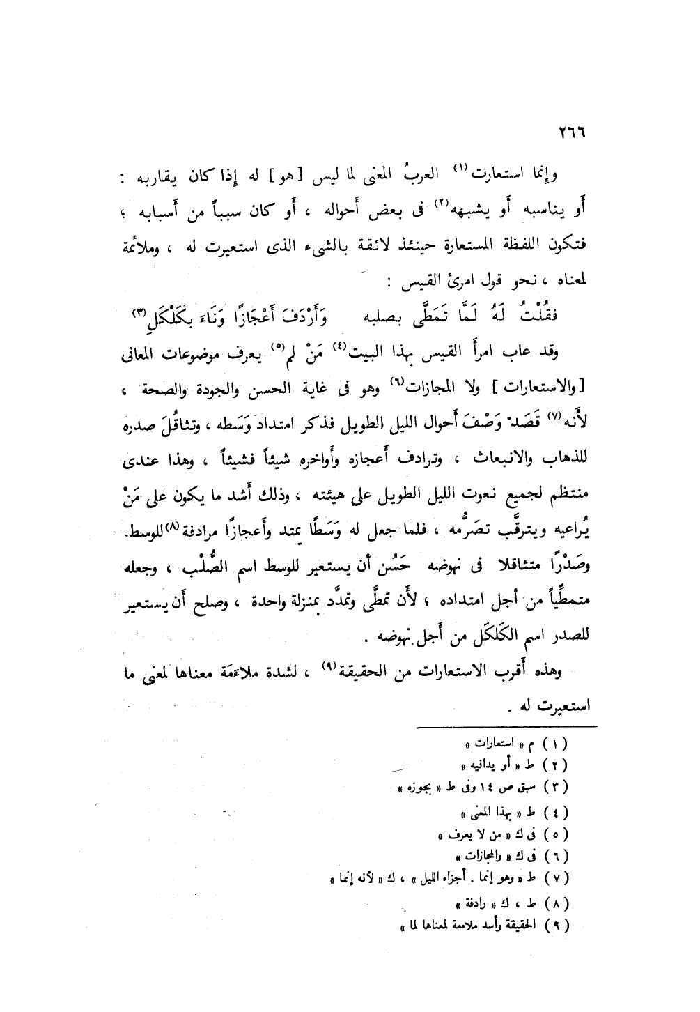 وقد عاب امرأ القيس بهذا المعنى من لم يعرف موضوعات المعاني ولا المجازات وهو في غاية الحسن والجودة والصحة، وهو إنما قصد وصف أجزاء الليل الطويل فذكر امتداد وسطه، وتثاقل صدره للذهاب والانبعاث، وترادف أعجازه وأواخره شيئاً فشيئاً، وهذا عندي منتظم لجميع نعوت الليل الطويل على هيئته، وذلك أشد ما يكون على من يثراعيه ويترقب تصرمه؛ فلما جعل له وسطاً يمتد وأعجازاً رادفة للوسط وصدراً متثاقلا في نهوضه حسن أن يتسعير للوسط اسم الصلب، وجعله متمطياً من أجل امتداده؛ لأن تمطى وتمدد بمنزلة واحدة، وصلح أن يتسعير للصدر اسم الكلكل من أجل نهوضه، وهذه أقرب الاستعارات من الحقيقة، وأسد ملاءمةً لمعناها لما استعيرت له.