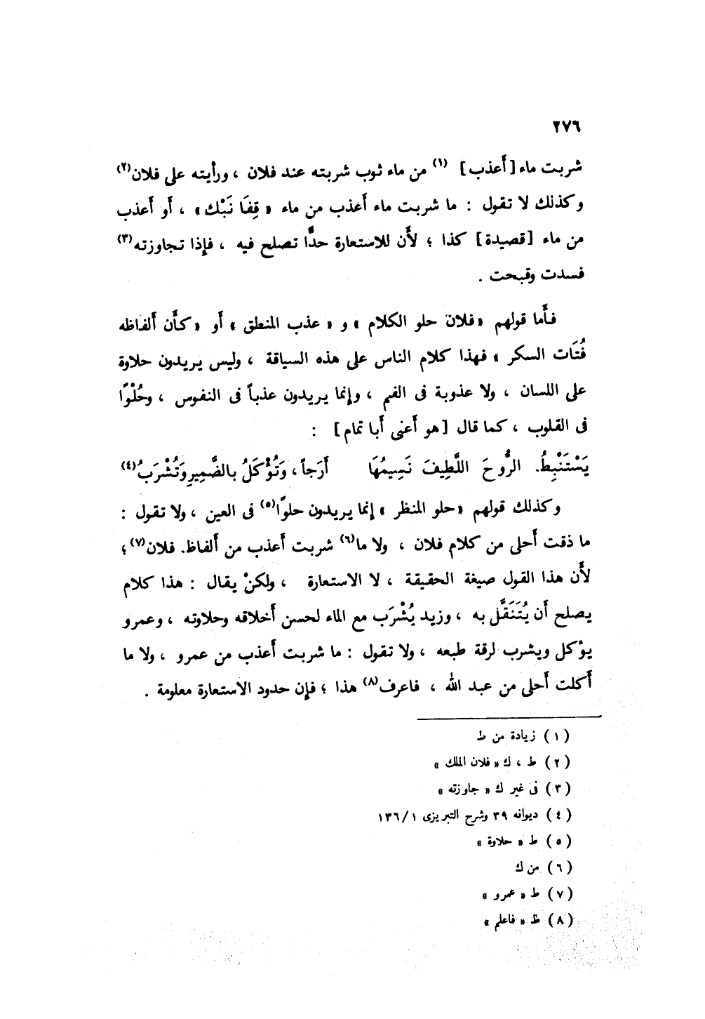 شربت ماء أعذب من ماء أعذب من ماء ثوب شربته عند فلان، أورأيته على فلان الملك؛ وكذلك لا تقول: ما شربت ماء أعذب من ماء " قفا نبك " أو أعذب من ماء قصيدة كذا؛ لأن للستعارة حداً تصلح فيه، فإذا جاوزته فسدت وقبحت.
