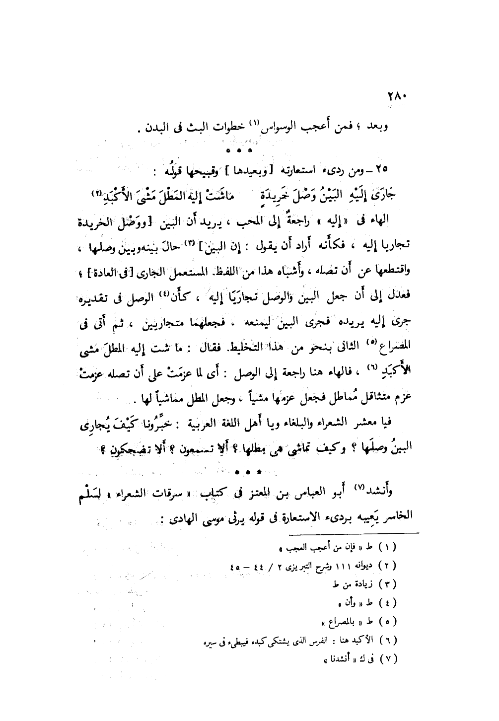 الهاء في " إليه " راجعةٌ إلى المحب، يريد أن البين " ووصل الخريدة تجاريا إليه، فكأنه أراد أن يقول: إن البين " حال بينه وبين وصلها، واقتطعها عن أن تصله، وأشباه هذا من اللفظ المستعمل الجاري، فعدل إلى أن جعل البين والوصل تجاريا إليه، وأن الوصل في تقديره جرى إليه يريده فجرى البين ليمنعه، فجعلهما متجاريين، ثم أتى في المصراع الثاني بنحو من هذا التخليط، فقال: ماشت إليه المطل مشى الأكبد، فالهاء هنا راجعة إلى الوصل: أي لما عزمت على أن تصله عزمت عزم متثاقلٍ مماطل فجعل عزمها مشيا، وجعل المطل مماشيا لها، فيا معشر الشعراء والبلغاء ويا أهل اللغة العربية: خبرونا كيف يجاري البين وصلها؟ وكيف تماشي هي مطلها؟ ألا تسمعون؟ ألا تضحكون؟ وأنشد أبو العباس ابن المعتز في كتاب سرقات الشعراء لسلم الخاسر يعيبه بردئ الاستعارة في قوله يري موسى الهادي: