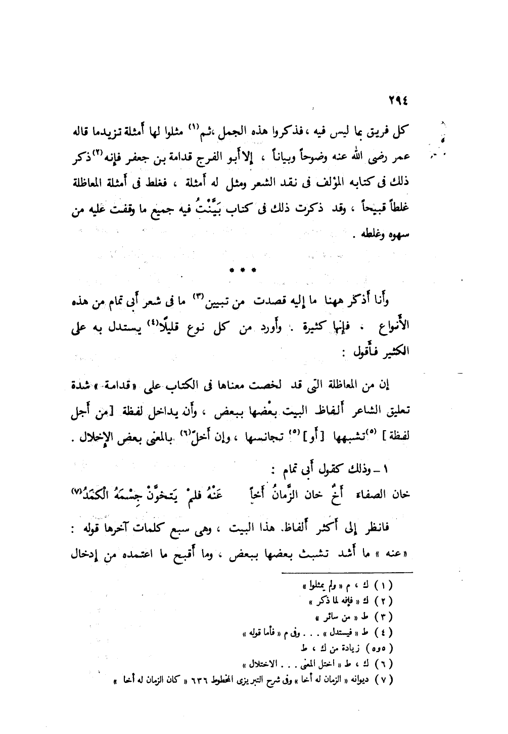 وأنا أذكر ههنا ما إليه قصدت من سائر ما في شعر أبي تمام م هذه الأنواع فإنها كثيرة، وأورد من كل نوع قليلا، فيستدل به على الكثير؛ فأقول: إن من المعاظلة التي قد لخصت معناها في الكتاب على قدامة شدة تعليق الشاعر ألفاظ البيت بعضها ببعض، وأن يداخل لفظة من أجل لفظة تشبهها أو تجانسها، وإن اختل المعنى بعض الاختلال.