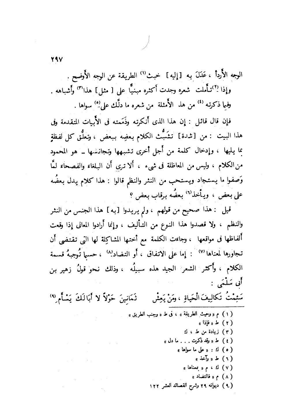 قيل: هذا صحيح من قولهم، ولم يريدوا هذا الجنس من النثر والنظم، ولا قصدوا هذا النوع من التأليف، وإنما أرادوا المعاني إذا وقعت ألفاظها في مواقعها، وجاءت الكلمة مع أختها المشاكلة لها التي تقتضي أن تجاورها بمعناها: إما على الاتفاق، أو التضاد، حسما توجبه قسمة الكلام، وأكثر الشعر الجيد هذه سبيله، ونحو ذلك قول زهير بن أبي سلمى: