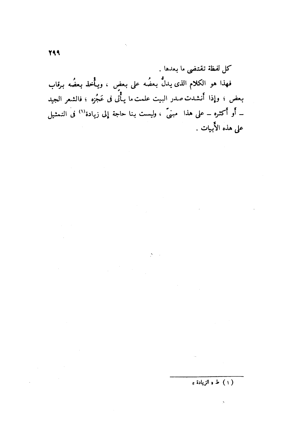 فهذا هو الكلام الذي يدل بعضه على بعض، وياخذ بعضه برقاب بعض؛ إذا أنشدت صدر البيت علمت ما ياتي في عجزه؛ فالشعر الجيد - أو أكثره - على هذا مبني، وليست بنا حاجة إلى الزيادة في التمثيل على هذه الأبيات.