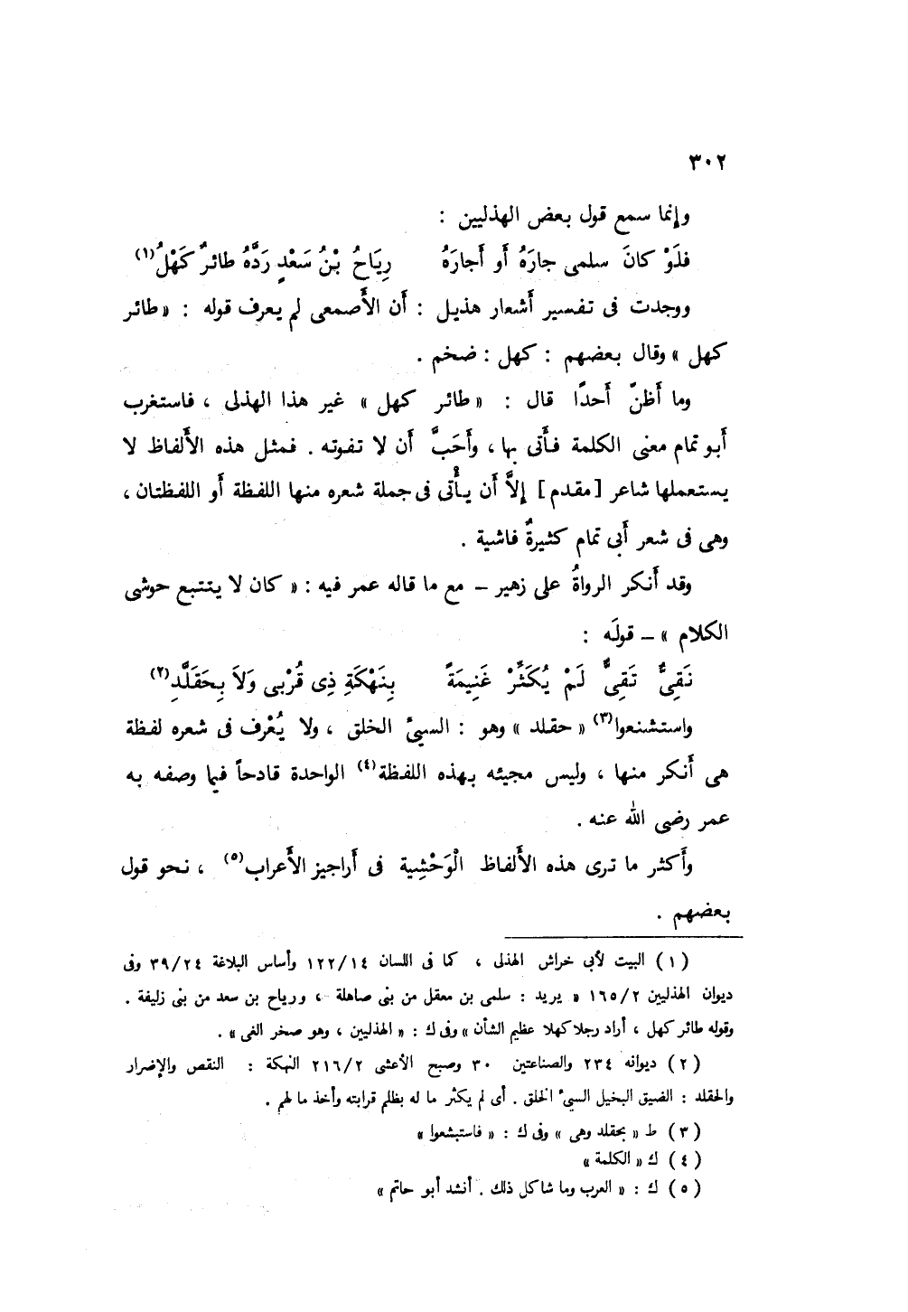 ووجدت في تفسير أشعار هذيل أن الأصمعي لم يعرف قوله " طائر كهل " وقال بعضهم: كهل ضخم، وما أظن أحداً قال " طائر كهل " غير هذا الهذلي، فاستغرب أبو تمم معنى الكلمة فأتى بها، وأحب أن لا تفوته؛ فمثل هذه الألفاظ لا يستعملها شاعر متقدمٌ إلا أن يأتي في جملة شعره منها اللفظة واللفظتان، وهي في شعر أبي تمام كثيرةٌ فاشية، وقد أنكر الرواة على زهير - مع ما قاله عمر رضي الله عنه " إنه كان لا يتتبع حوشي الكلام " - قوله: