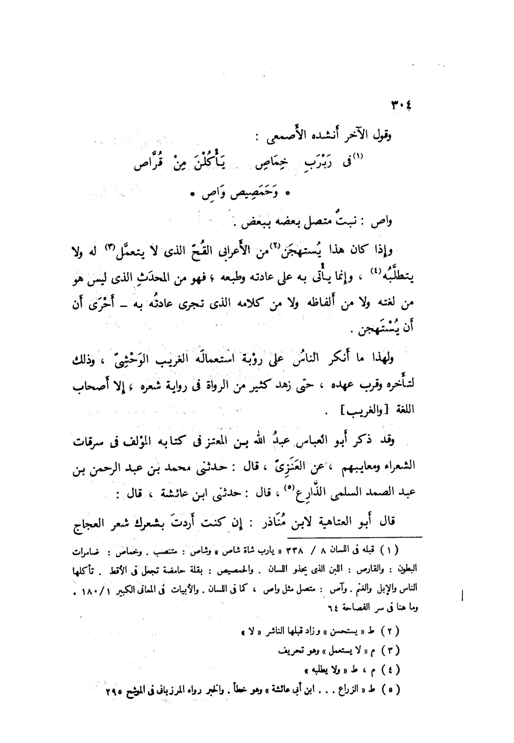 وإذا كان هذا يستهجن من الأعرابي القح الذي لا يتعممل له ولا يطلبه، وإنما يأتي به على عادته وطبعه؛ فهو من المحدث - الذي ليس هو من لغته ولا من ألفاظه ولا من كلامه الذي تجري عادته به - أحرى أن يستهجن، ولهذا أنكر الناس على رؤبة استعماله الغريب الوحشي، وذلك لتأخره وقرب عهده، حتى زهد كثير من الرواة في رواية شعره إلا أصحاب اللغة والغريب.