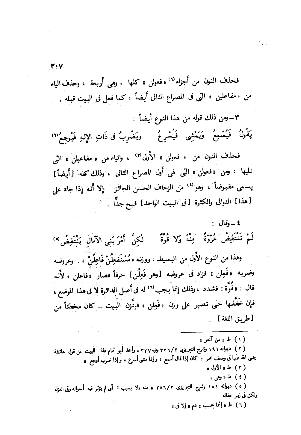 فحذف النون من " فعولن " الأول، والياء من " مفاعيلن " التي تليها، ومن " فعولن " التي هي أول المصراع الثاني، وذلك كله يسمى مقبوضاً، وهو من الزحاف الحسن الجائز، إلا أنه إذا جاء علىلتوالي والكثرة في البيت الواحد قبح جداً.