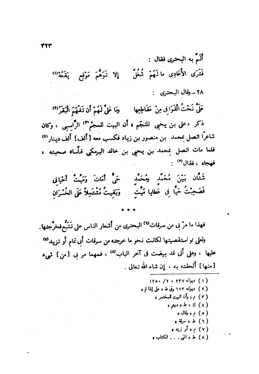 فهذا ما مر بى من سرقة البحترى من أشعار الناس على غير تتبع فخرجتها ولعلى لواستقصيتها لكانت نحو ماخرجته من سرقات أبى تمام وتزيد عليها وعلى أننى قد بيضت فى آخر الكتاب فمهما مر بى شىْ ألحقته به إن شاء الله تعالى.
