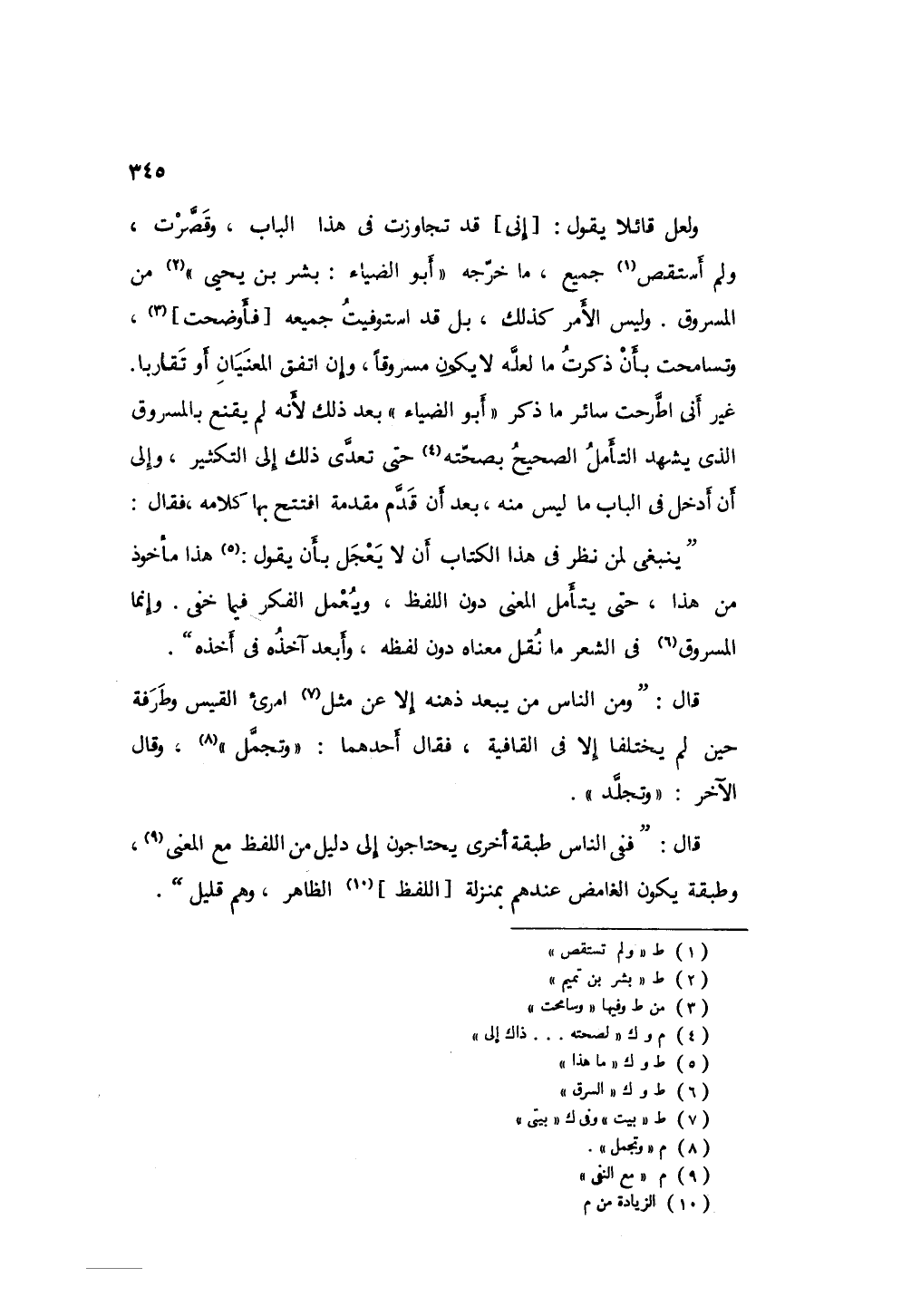 ولعل قائلاً يقول: إني قد تجاوزت فى هذا الباب، وقصرت، ولم تستقص جميع ما خرجه أبو الضياء بشر بن تميم من المسروق، وليس الأمر كذلك، بل قد استوفيت جميعه، فأوضحت، وسامحت بأن ذكرت مالعله لا يكون مسروقا "، وإن اتفق المعنيان أو تقاربا، غير أنى اطرحت سائر ماذكره أبو الضياء بعد ذلك لأنه لم يقنع بالمسروق الذى يشهد التأمل الصحيح بصحته، حتى تعدى ذلك إلى التكثير، وإلى أن أدخل فى الباب ما ليس منه، بعد أن قدم مقدمة افتتح بها كلامه.