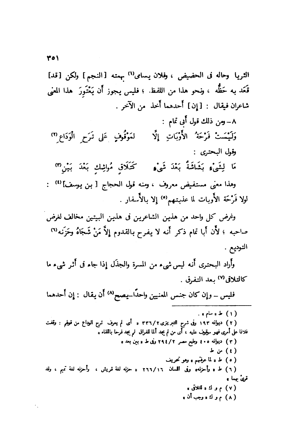 وهذا معنى مستفيض معروف، ومنه قول الحجاج بن يوسف: لولا فرحة الأوبات لما عذبتهم إلا بالأسفار، وغرض كل واحد من هذين الشاعرين في هذين البيتين مخالف لغرض صاحبه؛ لأن أبا تمام ذكر أنه لا يفرح بالقدوم إلا من شجاه وأحزنه التوديع، وأراد البحتري أنه ليس شيء من المسرة والجذل إذا جاء في أثر شيء ما كالتلاقي بعد التفرق؛ فليس - وإن كان جنس المعنيين واحداً - يصح أن يقال: إن أحدهما