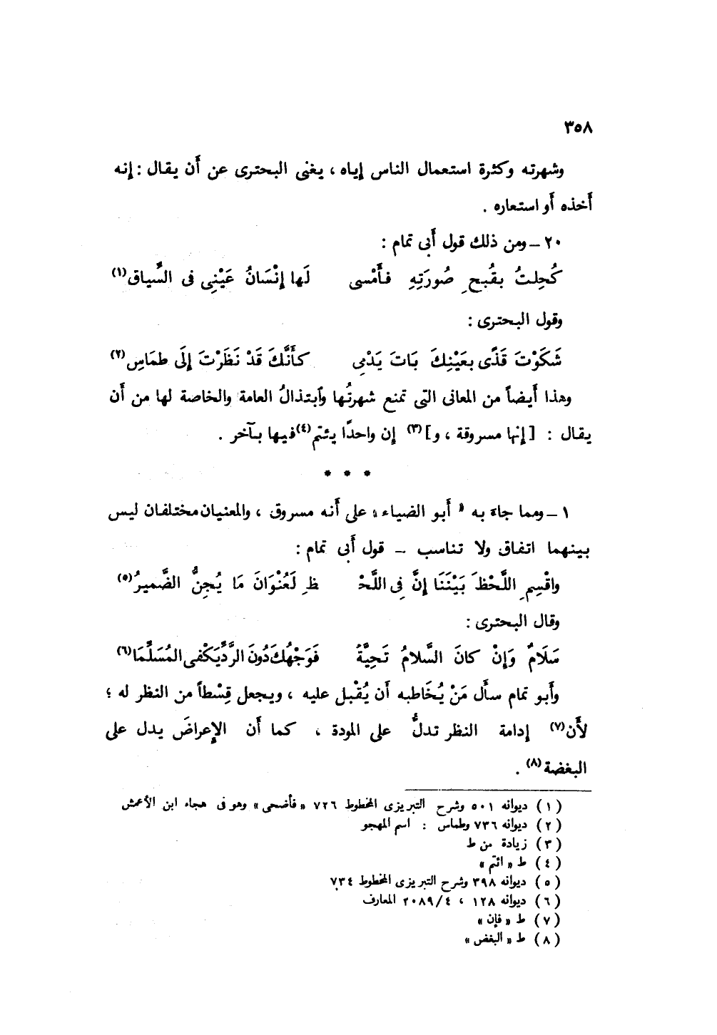 21 - ومما جاء به أبو الضياء على أنه مسروق، والمعنيان مختلفان ليس بينهما اتفاق ولا تناسب، قول أب يتمام: