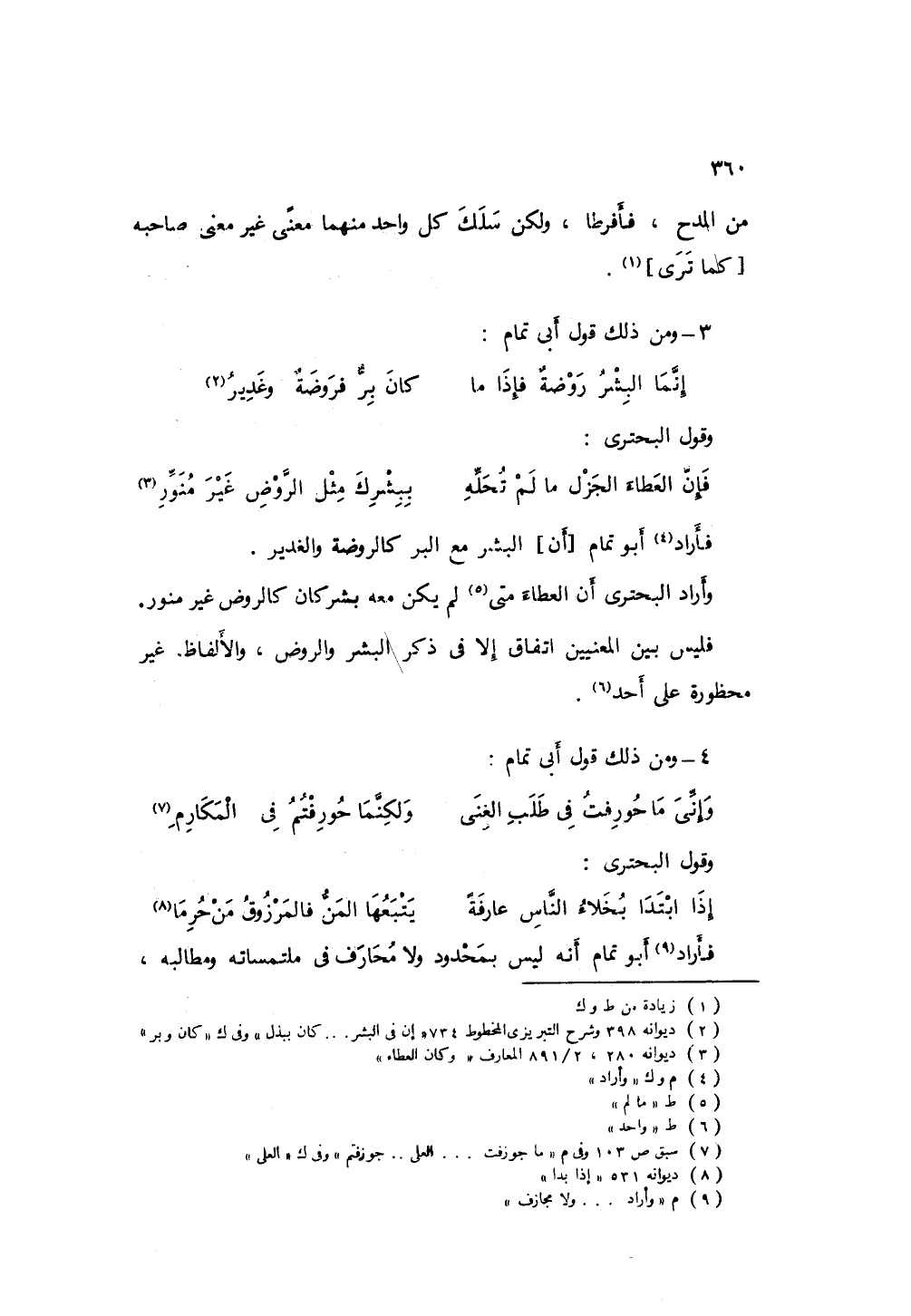 فأراد أبو تمام البشر مع البر كالروضة والغدير، وأراد البحتري أالعطاء ما لم يكن معه بشر كان كالروض غير منور؛ فليس بين المعنيين اتفاق إلا في ذكر البشر والروض، والألفاظ غير محظورة على واحد.