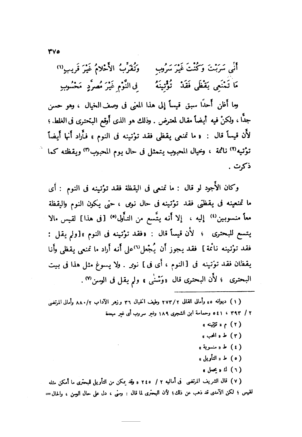 وما أظن أحداً سبق قيساً إلى هذا المعنى في وصف الخيال، وهو حسن جداً، ولكن فيه أيضاً مقال لمعترض، وذلك هو الذي أوقع البحتري في الغلط؛ لأن قيساً قال " ما تمنعي يقظى فقد تؤتينه في النوم " فأراد أيضا أنها تؤتيه نائمة، وخيال المحبوب يتمثل في حال نوم المحب ويقظته كما ذكرت، وكان الأجود لو قال: ما تمنعي في اليقظة فقد تؤتينه في النوم: أي ما تمنعينه في يقظتي فقد تؤتينه في حال نومي، حتى يكون النوم واليقظة معا منسوبين إليه، إلا أنه يتسع من التأويل لقيس مالا يتسع للبحتري، لأن قيسا قال " فقد تؤتينه في النوم " ولم يقل: فقد تؤتينه نائمة فقد يجوز أن يحمل على أنه أراد ما تمنعي يقظي وأنا يقظان فقد تؤتينه في النوم: أي في نومي، ولا يسوغ مثل هذا في بيت البحتري؛ لأن البحتري قال وسنى ولم يقل في الوسن.