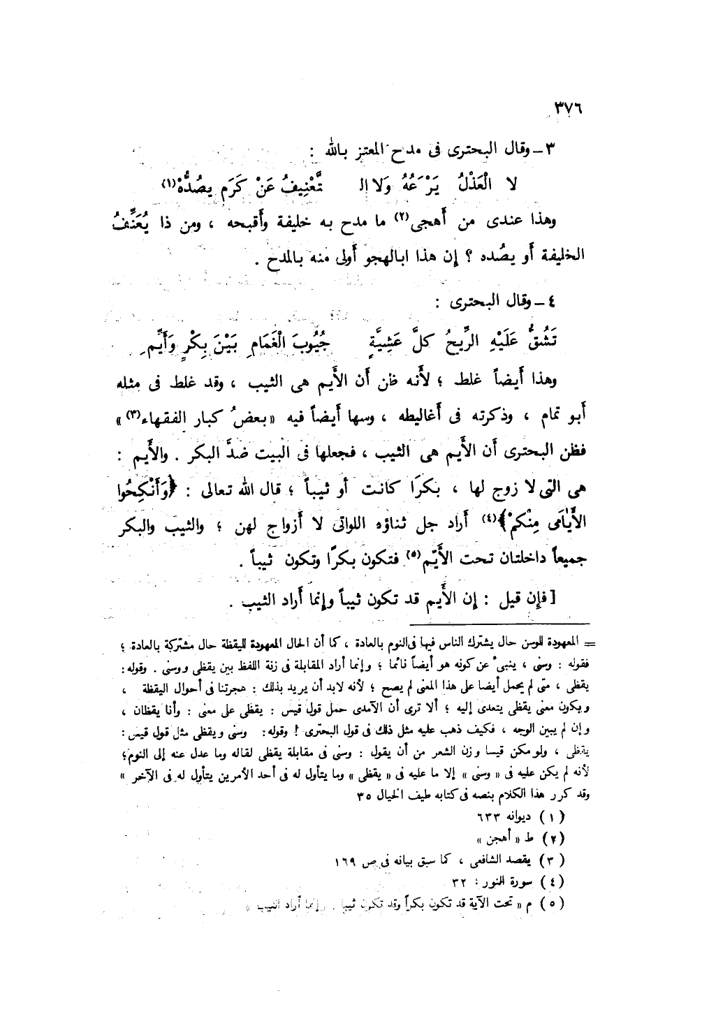 وهذا أيضا غلط؛ لأنه ظن أن الأيم هي الثيب، وقد غلط في مثله أبو تمام، وذكرته في أغاليطه، وسها فيه أيضاً بعض كبار الفهاء؛ فظن البحتري أن الأيم هي الثيب، فجعلها في البيت ضد البكر، والأيم: هي التي لا زوج لها، بكراً كانت أو ثيبا، قال الله تعالى: " وأنكحوا الأيامى منكم " أراد جل ثناؤه اللواتي لا أزواج لهن؛ فالبكر والثيب جميعا داخلتان تحت الأيم؛ فتكون بكراً وتكون ثيبا، وإنما أراد الثيب.