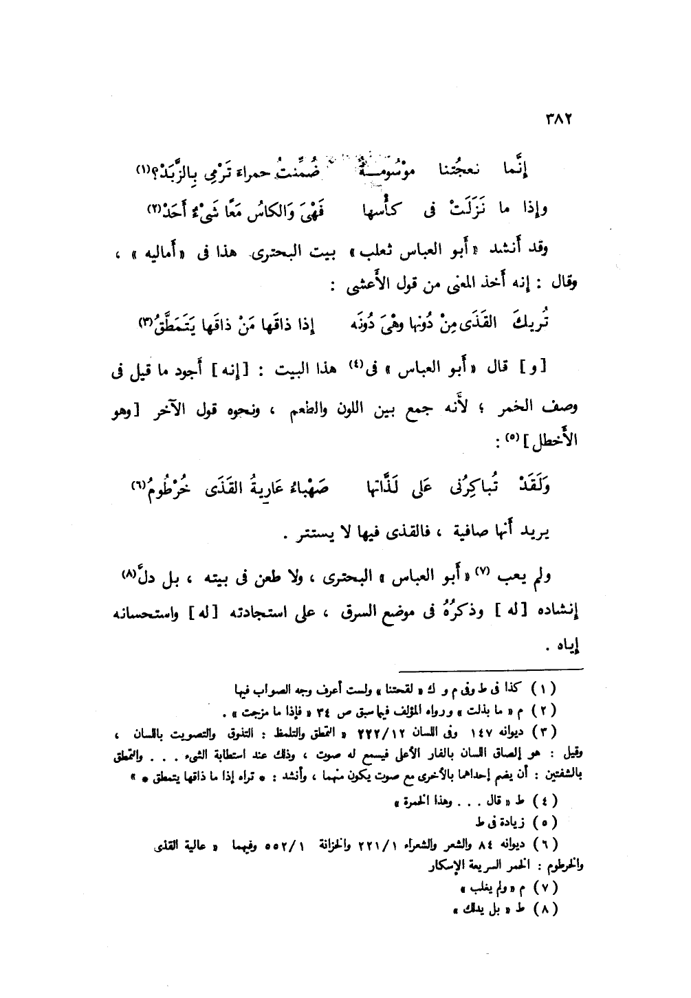 قال أبو العباس: وهذا البيت أجود ما قيل في وصف الخمرة؛ لأنه جمع بين اللون والطعم، ونحوه قول الآخر، وهو الأخطل: