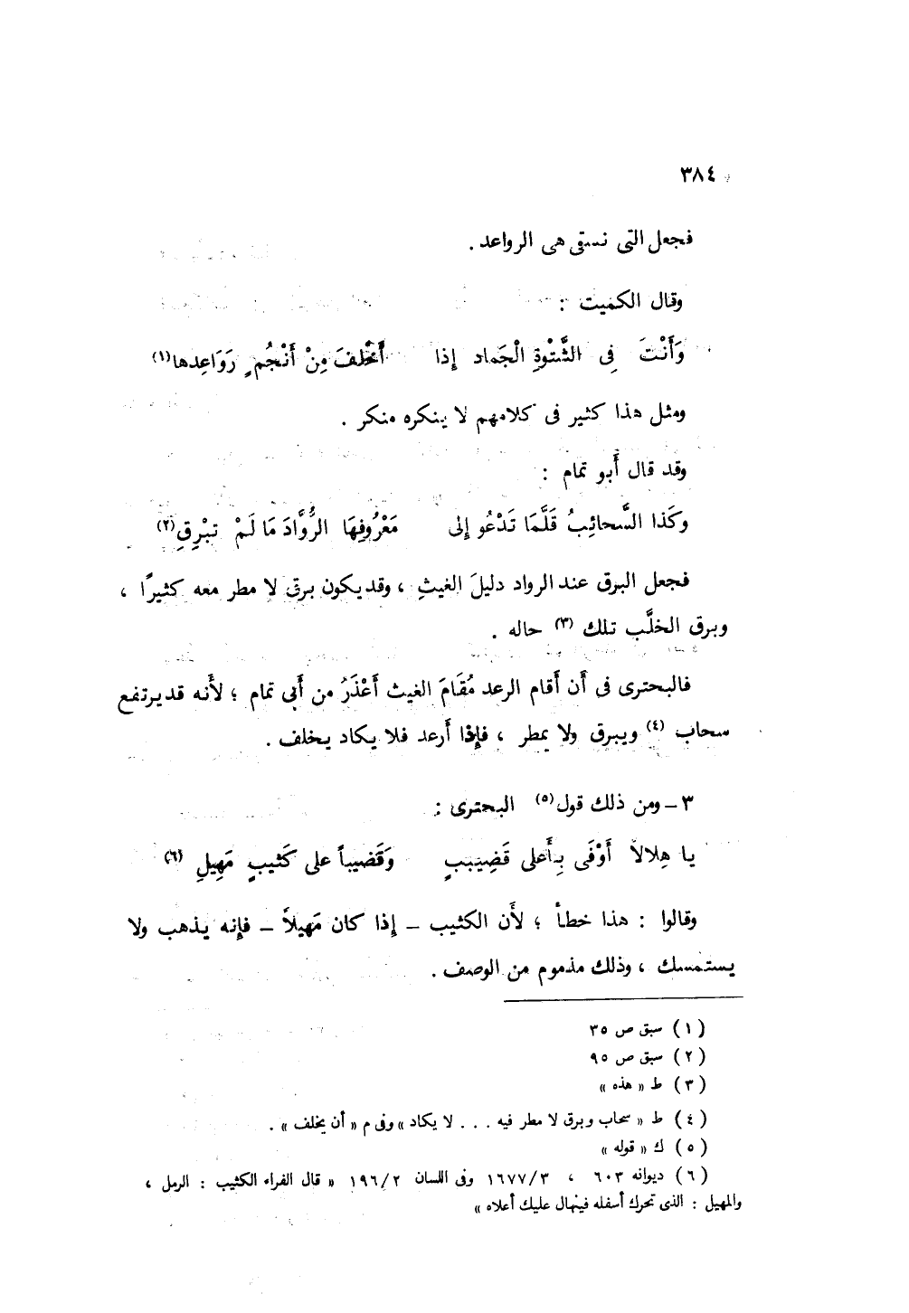 فجعل البرق عند الرواد دليل الغيث، وقد يكون برق لا مطر معه كثيراً، وبرق الخلب هذه حاله؛ فالبحتري في أن أقام الرعد مقام الغيث أعذر من أبي تمام لأنه قد يرتفع سحاب ويبرق ولا يمطر، فإذا أرعد لا يكاد يخلف.