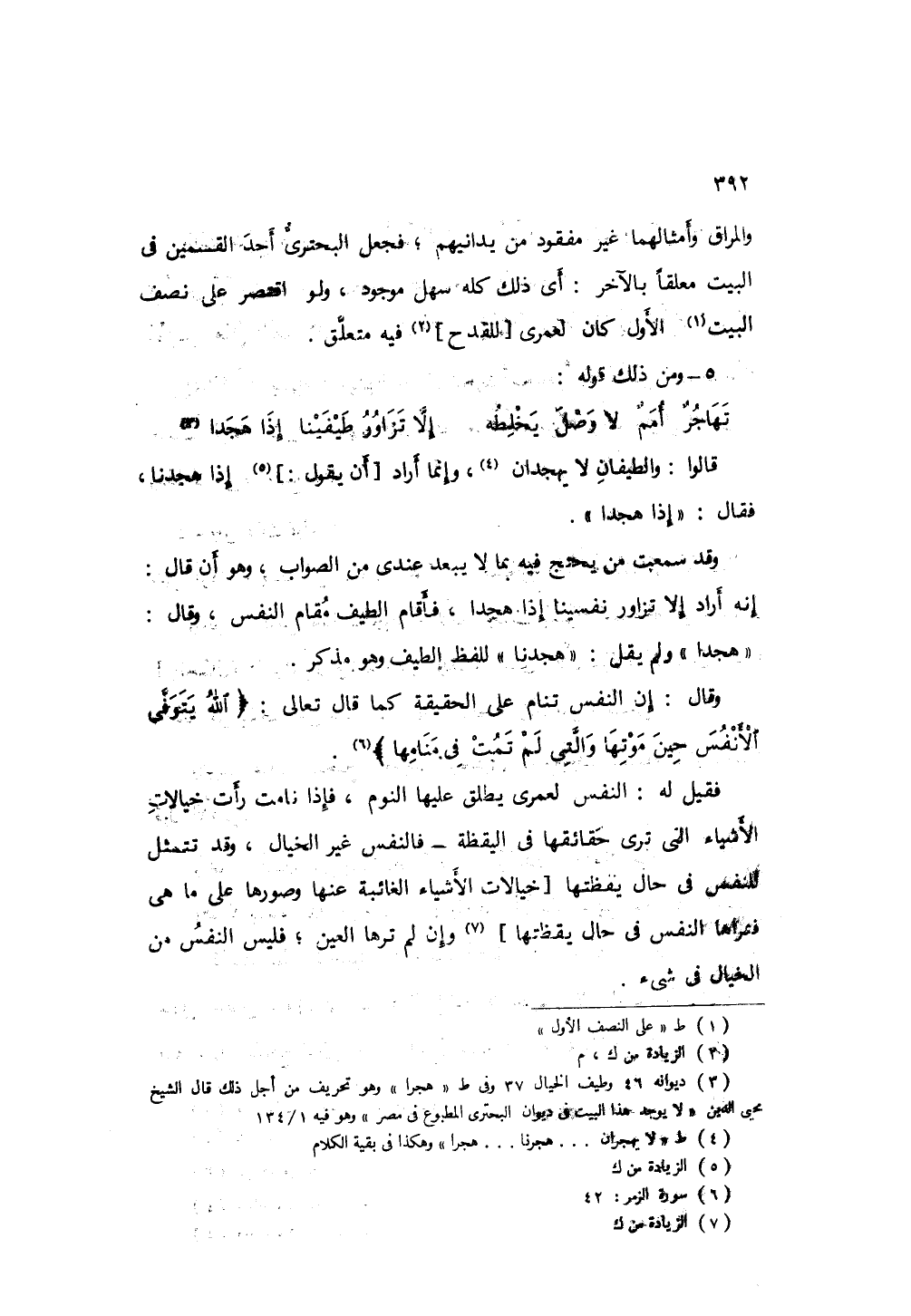 وقد سمعت من يحتج فيه بما لا يبعد عندي من الصواب، وهو أن قال: إنه أراد إلا تزوار نفسينا إذا هجدا؛ فأقام الطيف مقام النفس وقال " هجدا " ولم يقل " هجدتا " للفظ الطيف وهو مذكر، وقال: إن النفس تنام على الحقيقة كما قال تعالى: " الله يتوفى الأنفس حين موتها والتي لم تمت في منامها ".