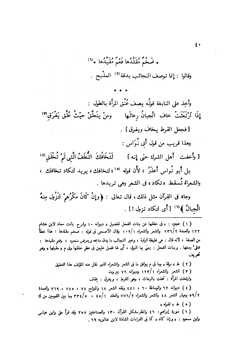 وقالوا: إنما توصف النجائب برقة المذبح وأخذ على النابغة قوله يصف عنق المرأة بالطول: