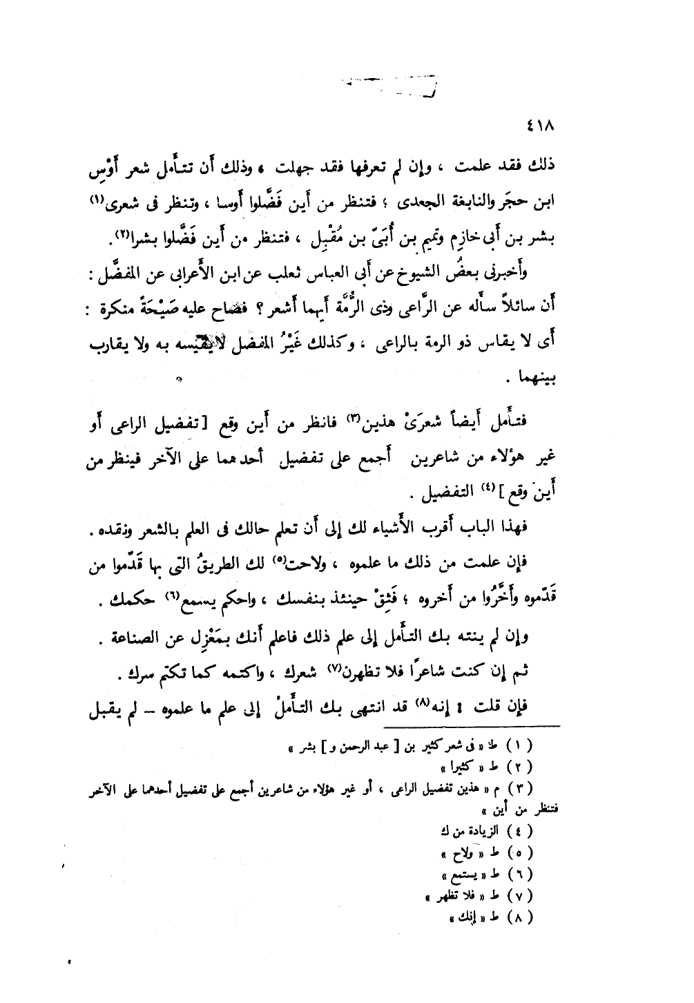ذلك فقد علمت، وإن لم تعرفها فقد جهلت، وذلك بأن تتأمل شعري أوس بن حجر والنابغة الجعدي؛ فتنظر من أين فضلوا أوساً، وتنظر في شعري بشر بن أبي خازم وتميم ابن أبي بن مقبل، فتنظر من أين فضلوا بشرا. وأخبرني بعض الشيوخ عن أبي العباس ثعلب عن ابن الأعرابي عن المفضل أن سائلا سأله عن الراعي وذى الرمة أيهما أشعر، فصاح عليه صيحة منكرة: أي لا يقاس ذو الرمة بالراعي، وكذلك غير المفضل لا يقيسه به ولا يقارب بينهما، فتأمل أيضاً شعري هذين فانظر من أين وقع التفضيل؛ فهذا الباب أقرب الأشياء لك إلى أن تعلم حالك في العلم بالشعر ونقده. فإن علمت من ذلك ما علموه، ولاح لك الطريق التي بها قدموا من قدموه وأخروا من أخروه؛ فثق حينئذ بنفسك، واحكم يستمع حكمك وإن لم ينته بك التأمل إلى علم ذلك فاعلم أنك بمعزل عن الصناعة، ثم إن كنت شاعرا فلا تظهر شعرك، واكتمه كما تكتم سرك، فإن قلت إنك قد انتهى بك التأمل إلى علم ما علموه لم يقبل