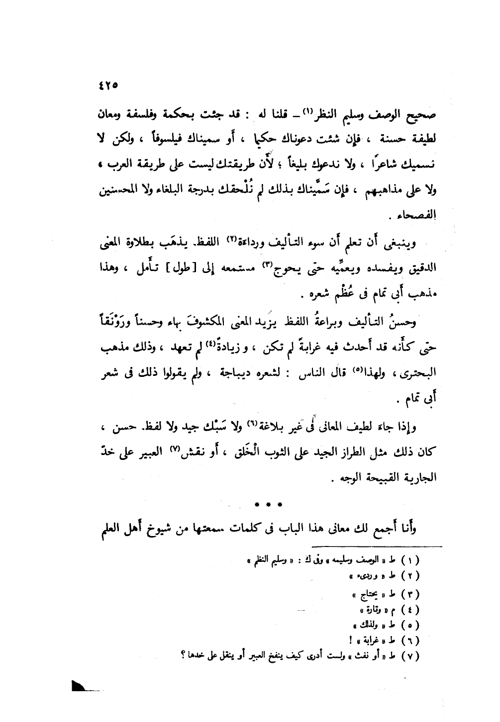 صحيح الوصف وسليم النظم قلنا له: قد جئت بحكمة وفلسفة ومعانٍ لطيفة حسنة، فإن شئت دعوناك حكيما، أو سميناك فيلسوفا، ولكن لا نسميك شاعراً، ولا ندعوك بليغاً؛ لأن طريقتك ليست على طريقة العرب، ولا على مذاهبم، فإن سميناك بذلك لم نلحقك بدرجة البلغاء، ولا المحسنين الفصحاء، وينبغي أن تعلم أن سوء التأليف وردئ اللفظ يذهب بطلاوة المعنى الدقيق ويفسده ويعميه حتى يحتاج مستمعه إلى طول تأمل، وهذا مذهب أبي تمام في عظم شعره، وحسن التأليف وبراعة اللفظ يزيد المعنى المكشوف بهاءً وحسناً ورونقاً حتى كأنه قد أحدث فيه غرابه لم تكن، وزيادةً لم تعهد، وذلك مذهب البحتري، ولذلك قال الناس: لشعره ديباجة، ولم يقولوا ذلك في شعر أبي تمام، وإذا جاء لطيف المعاني في غير بلاغة ولا سبك جيدٍ ولا لفظ حسن كان ذلك مثل الطراز الجيد على الثوب الخلق، أو نفث العبير على خد الجارية القبيحة الوجه.