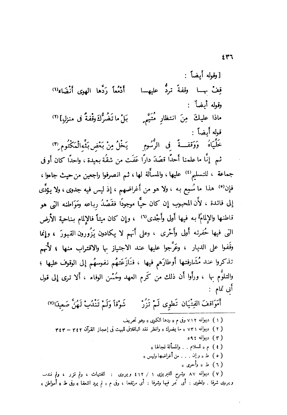 ثم إنا ما علمنا أحداً قصد داراً عفت من شقةٍ بعيدة، واحداً كان أو في جماعة، للتسليم عليها، والمسألة لها، ثم انصرفوا راجعين من حيث جاءوا، وإن هذا ما سمح به، ولا هو من أغراضهم؛ إذ ليس فيه جدوى، ولا يؤدي إلى فائدة، لأن المحبوب إن كان حياً موجوداً فقصد رباعه ومواطنه التي هو قاطنها والإلمام به فيها أولى وأحرى، وإن كان ميتا فالإلمام بناحية الأرض التي فيها حفرته أولى وأحرى، وعلى أنهم لا يكادون يزورون القبور، وإنما وقفوا علىلديار، وعرجوا عليها عند الاجتياز بها والاقتراب منها؛ لأنهم تذكروا عند مشارفتها أوطارهم فيها، فنازعتهم نفوسهم إلى الوقوف عليها، والتلوم بها، ورأوا أن ذلك من كرم العهد وحسن الوفاء، ألا ترى إلى قول أبي تمام: