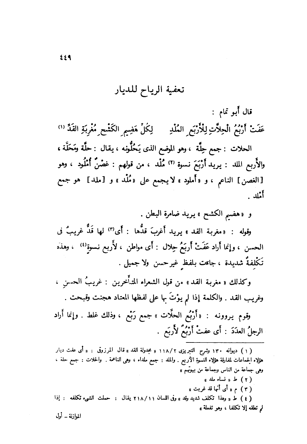 الحلات: جمع حلة هو الموضع الذى يحلونه يقال: حلة ومحلة والأربع الملد: يريد أربع نساء ملد من قولهم: غصن أملود وهو الناعم و " أملود " لا يجمع على " ملد " وأنما هو جمع أملد، و " هضيم الكشح " يريد ضامرة البطن وقوله " مغربة القد " يريد أغرب قدها: أى لها قد غريب فى الحسن وإنما أراد عفت أربع حلال: أى مواطنلأربع نسوة وهذا تكف شديد وقد جاءت بلفظ غير حسن ولاجميل، وكذلك " مغربة القد " من قول الشعراء المتأخرين: غريب الحسن وغريب القدوالكلمة إذا لم يؤت بها على لفظها المعتاد هجنت وقبحتوقوم يروونه " أربع الحلات " جمع ربع وذلك غلط، وأنما أراد الرجل العدد: أى عفت أربع لأربع