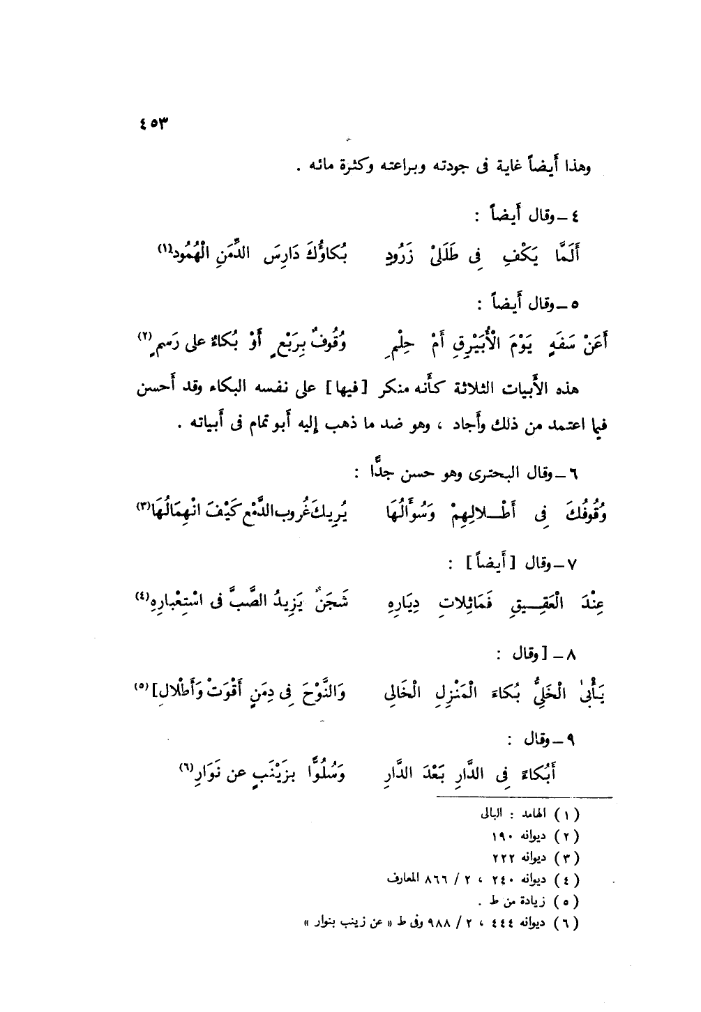هذه الأبيات الثلاثة كأنه منكر على نفسه البكاء، وقد أحسن فيما اعتمد من ذلك وأجاد، وهو ضد ما ذهب إليه أبو تمام في أبياته.