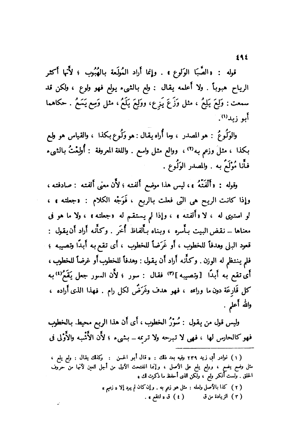 قوله: «الصبا الولوع»، وإنما أراد المولعة بالهبوب، لأنها أكثر الرياح هبوباً، ولا أعلمه يقال: ولع بالشيء يولع فهو ولوع، ولكن قد سمعت: وَلِعَ يَلِعُ، مثل وزع يزع، وولع يلع، مثل وسع يسع، حكاهما أبو زيد (1).