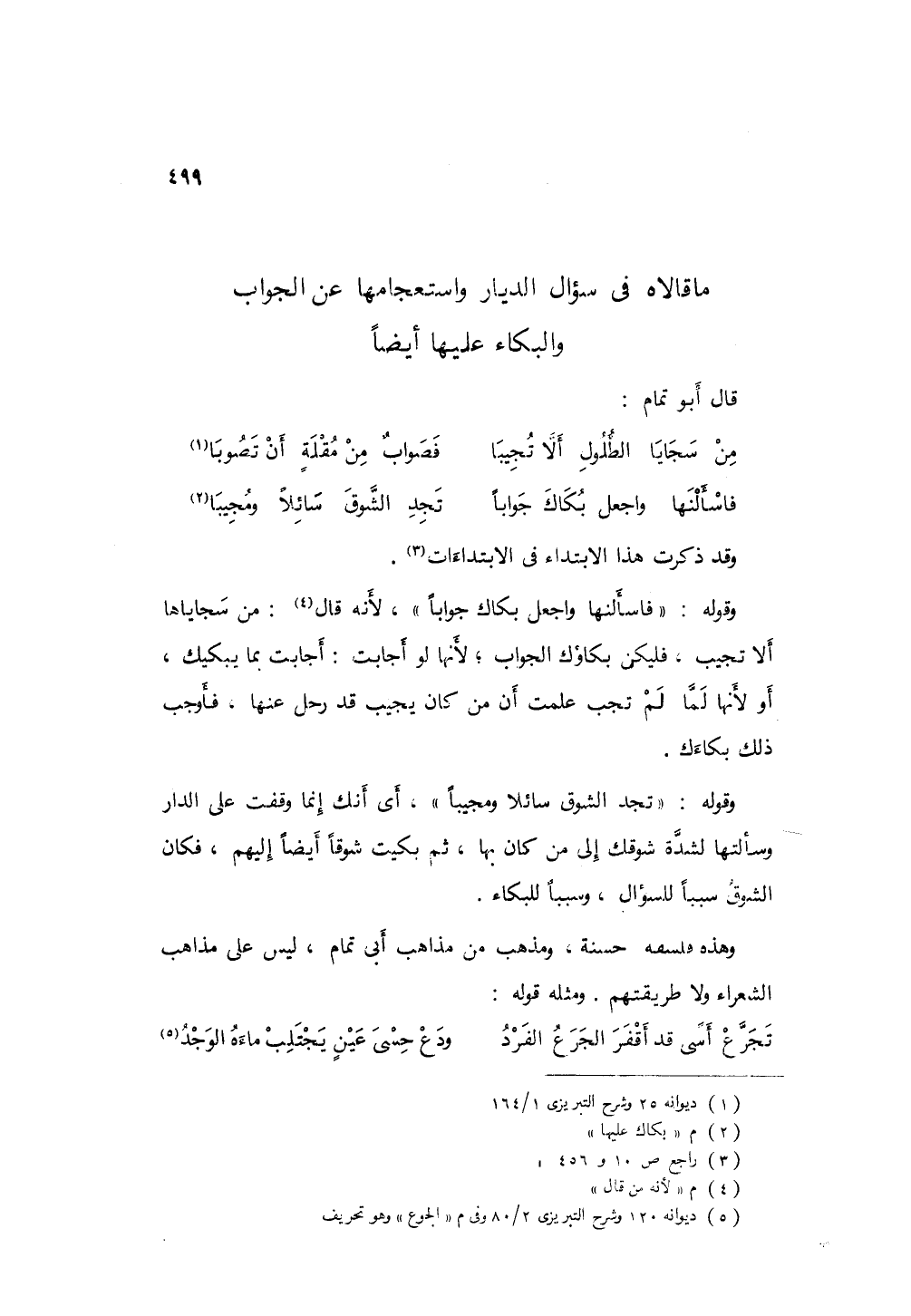 وقوله: «فاسألنها واجعل بكاك جواباً»، لأنه قال (4): من سجاياها ألا تجيب، فليكن بكاؤك الجواب؛ لأنها لو أجابت: أجابت بما يبكيك، أو لأنها لما لم تجب علمت أن من كان يجيب قد رحل عنها، فاوجب ذلك بكاءك.