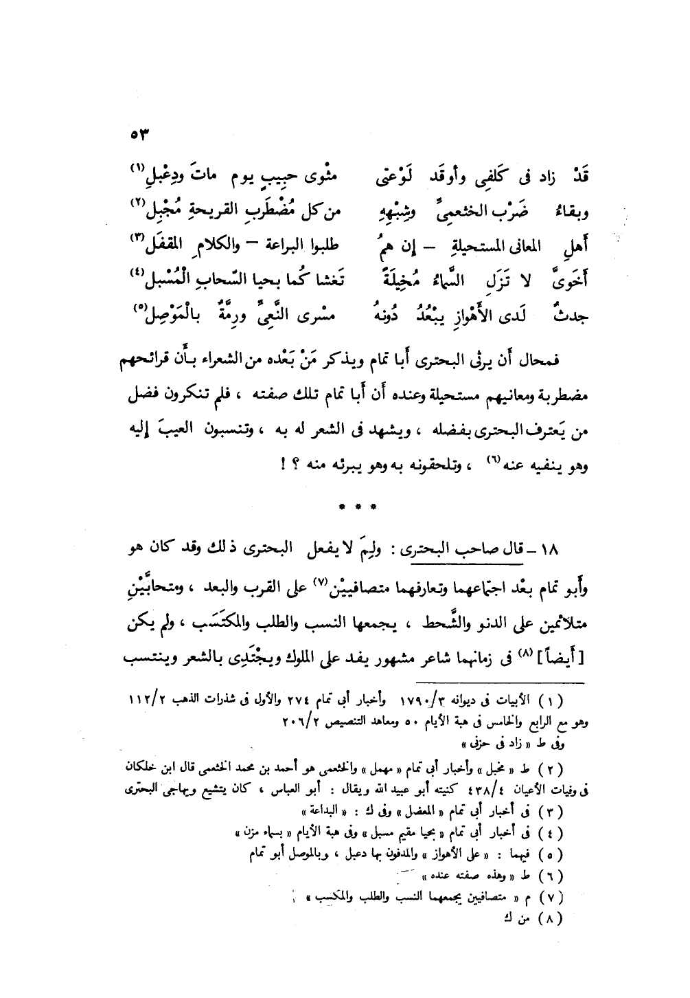 18 - قال صاحب البحتري: ولم لا يفعل البحتري ذلك وقد كان هو وأبو تمام - بعد اجتماعهما وتعارفهما - متصافيين على القرب والبعد، متحابين متلائمين على الدنو والشحط، يجمعهما الطلب والنسب والمكتسب، ولم يكن في زمانهما شاعر مشهور يفد على الملوك ويجتدي بالشعر وينتسب
