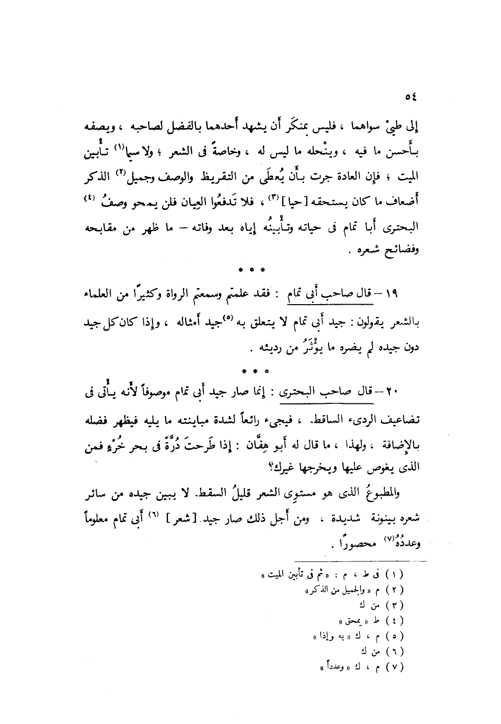 19 - قال صاحب أب يتمام: فقد علمتم وسمعتم الرواة وكثيراً من العلماء بالشعر يقولون: جيد أبي تمام لا يتعلق به جيد أمثاله، وإذا كان جيد دون جيده لم يضر ما يؤثر من رديئه.
