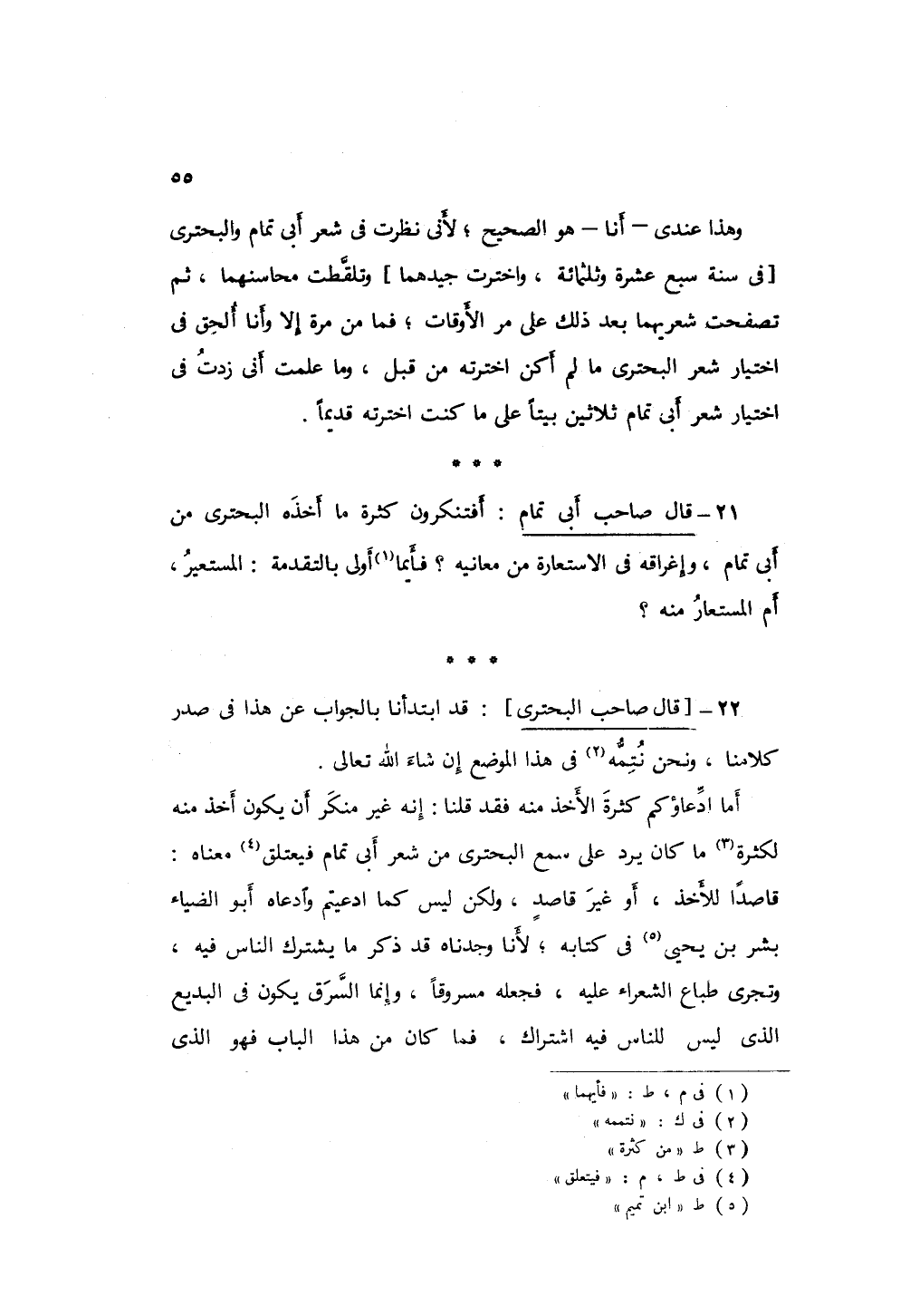 23 - قال صاحب أبي تمام: أفتنكرون كثرة ما أخذه البحتري من أب يتمام، وإغراقه في الاستعارة من معانيه؟ فأيهما أولى بالتقدمة: المستعير، أو المستعار منه؟ 24 - قال صاحب البحتري: قد ابتدأنا بالجواب عن هذا في صدر كلامنا، ونحن نتمه في هذا الموضع إن شاء الله تعالى: أما ادعاؤكم كثرة الأخذ منه فقد قلنا إنه غير منكرٍ أن يكون أخذ منه من كثرة ما كان يرد على سمع البحتري من شعر أب يتمام؛ فيعتلق معناه: قاصداً الأخذ، أو غير قاصدٍ، لكن ليس كما ادعيتم وادعاه أبو الضياء بشر بن يحيى ف يكتابه؛ لأنا وجدناه قد ذكر ما يشترك الناس فيه، وتجري طباع الشعراء عليه، فجعله مسروقاً، وإنما السرق يكون في البديع الذي ليس للناس فيه اشتراك، فما كان من هذا الباب فهو الذي