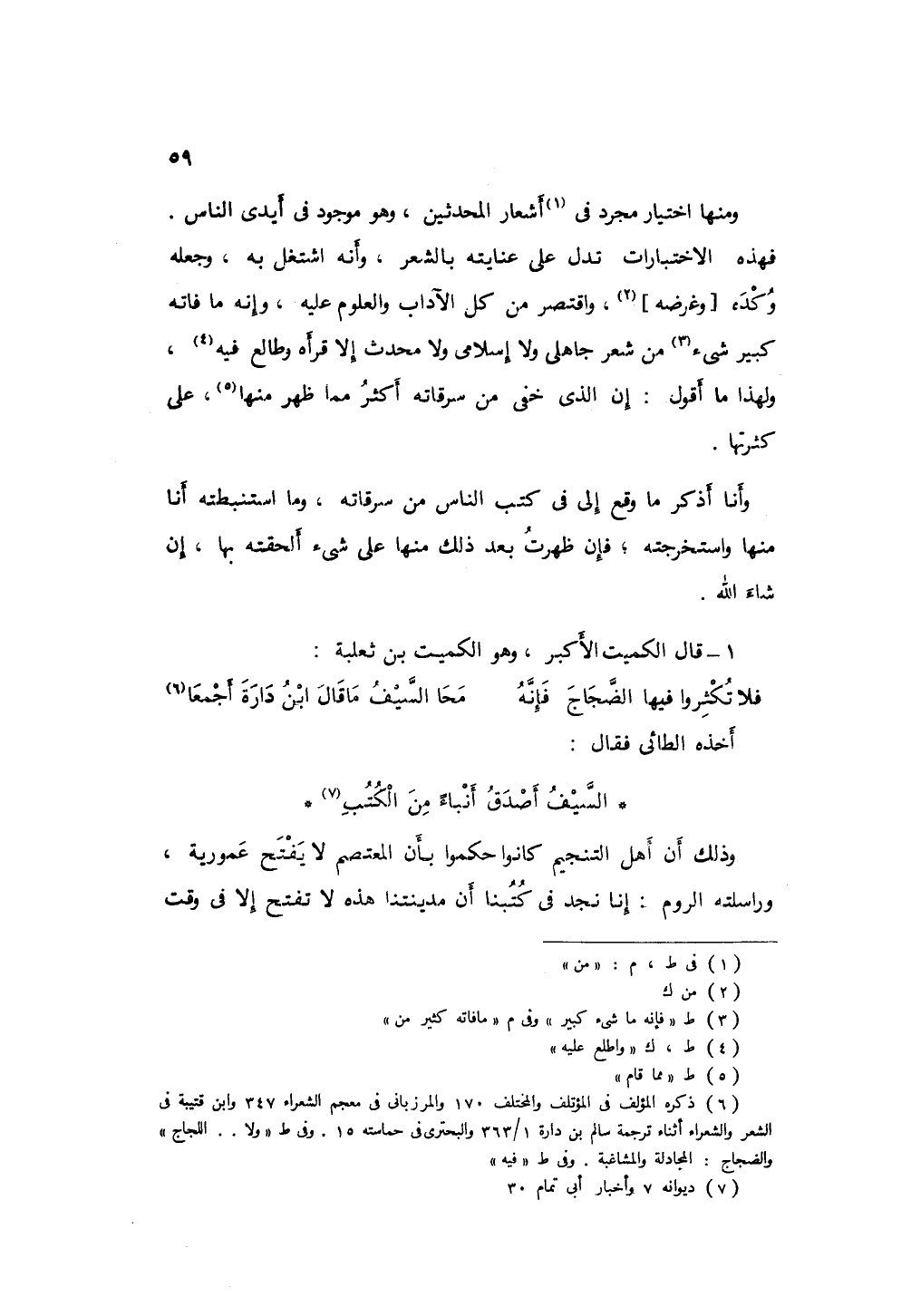 ومنها اختيار مجرد في أشعار المحدثين، وهو موجود في أيدي الناس؛ وهذه الاختيارات تدل على عنايته بالشعر، وأنه اشتغل به، وجعله وكده، واقتصر من كل الآداب والعلوم عليه؛ فإنه ما شيء كبير من شعر جاهلي ولا إسلامي ولا محدث إلا قرأه واطلع عليه، ولهذا أقول: إن الذي خفى سرقاته أكثر مما قام منها، على كثرتها.