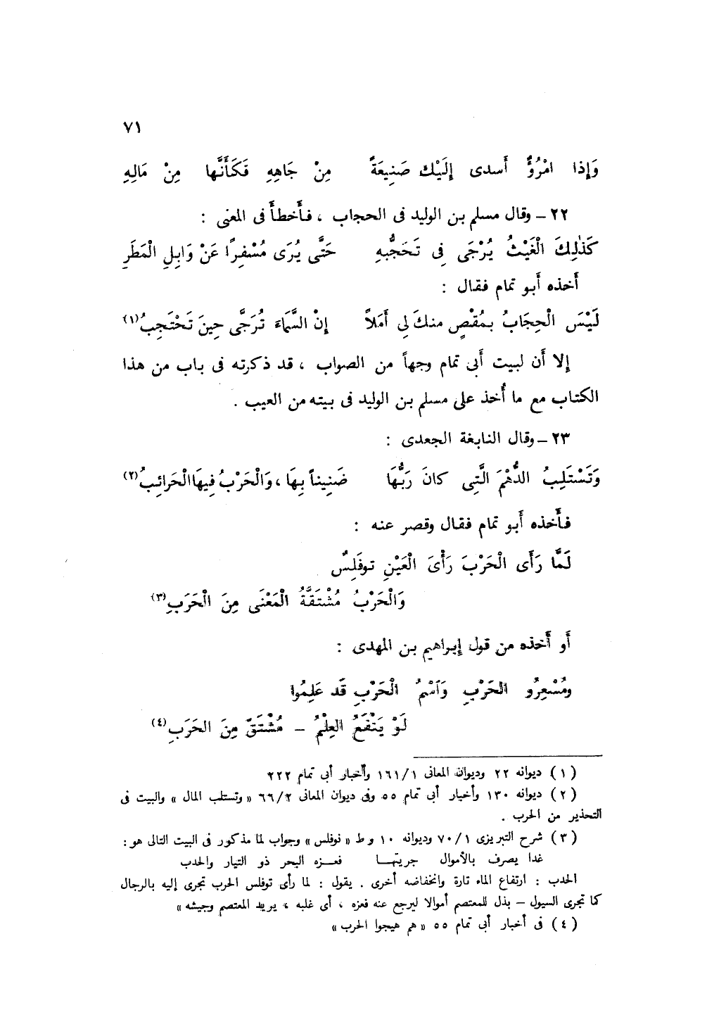 إلا أن لبيت أبي تمام وجهاً من الثواب، وقد ذكرته في بابٍ ف يهذا الكتاب مع ما أخذ على مسلم بن الوليد في بيته من العيب.