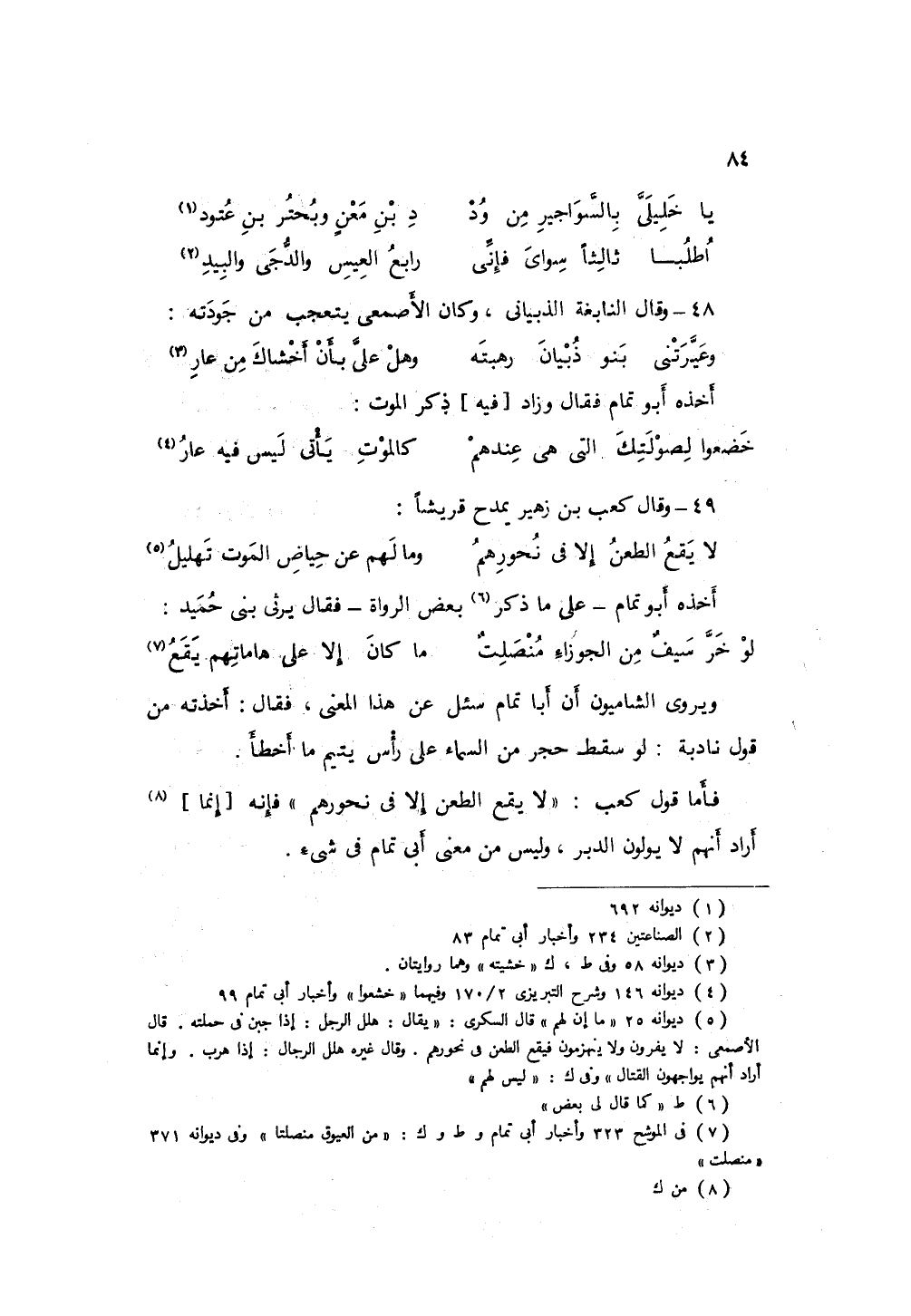 روى الشاميون أن أبا تمام سئل عن هذا المعنى فقال أخذته من قول نادبه: لو سقط حجر من السماء على رأس يتيم ما أخطأ فأما قول كعب لا يقع الطعن إلا في نحورهم فإنما أراد أنهم لا يولون الدبر وليس من معنى أبي تمام في شيىء