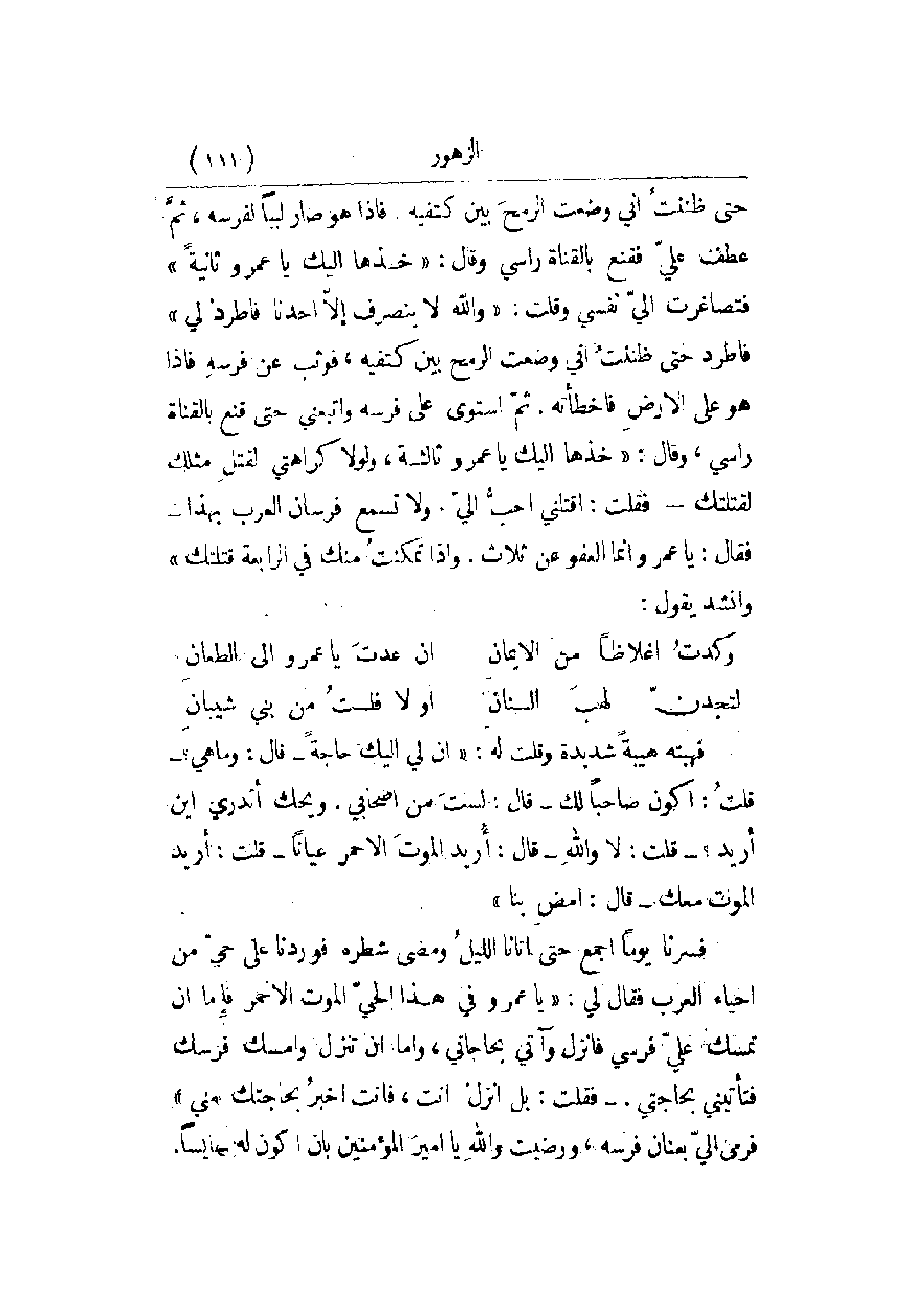 فسرنا يوماً أجمع حتى أتانا الليل ومضى شطره فوردنا على حي من أحياء العرب فقال لي: يا عمرو في هذا الحي الموت الأحمر فإما أن تمسك علي فرسي فأنزل وآتي بحجاتي، وإما أن تنزل وأمسك فرسك فتأتيني بحاجتي. فقلت: بل انزل أنت، فأنت أخبر بحاجتك مني فرمى إلي بعنان فرسه، ورضيت والله يا أمير المؤمنين بأن أكون له سايساً.